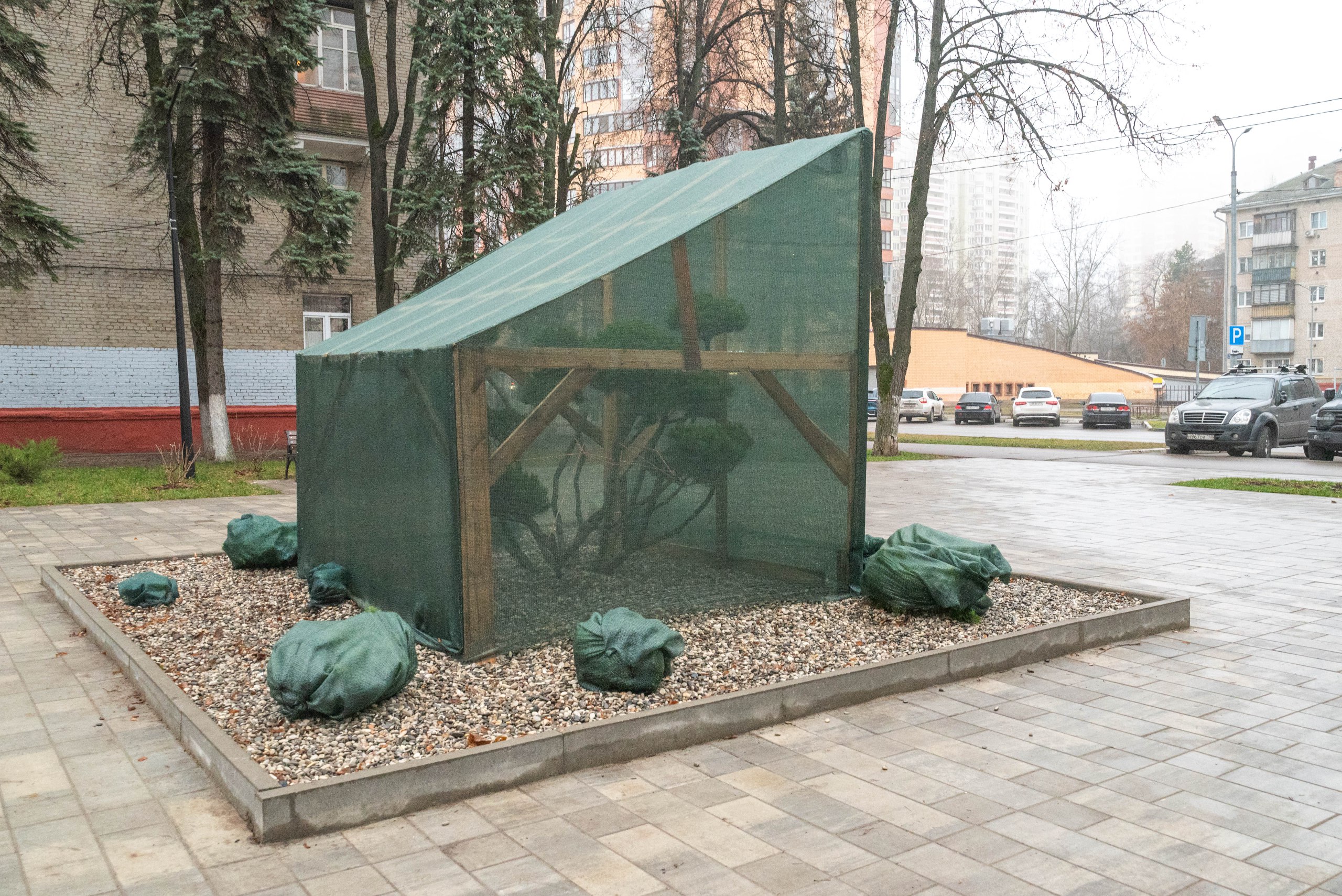 Редкий бонсай в новом сквере Реутова защитили от зимних холодов