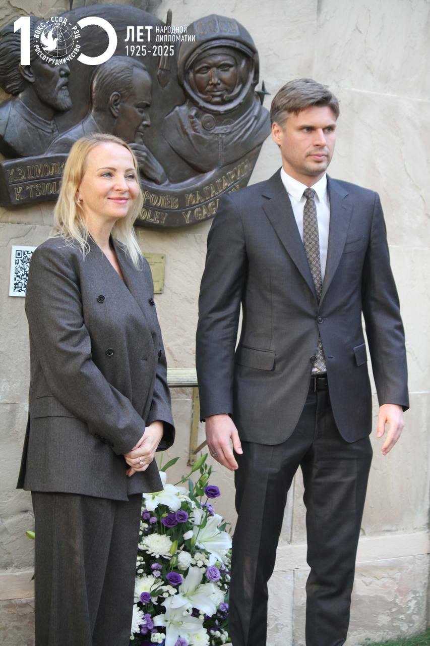 Завершая визит, делегация «Роскосмоса» возложила цветы к панно «Пионерам космоса» — К.Э.Циолковскому, С.П.Королеву и Ю.А.Гагарину.