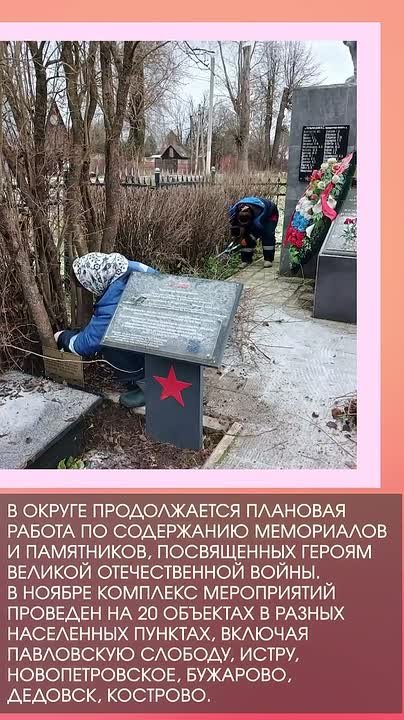 В округе продолжается плановая работа по содержанию мемориалов и памятников, посвященных героям Великой Отечественной войны. В ноябре комплекс мероприятий проведен на 20 объектах в разных населенных пунктах, включая Павловскую Слободу, Истру, Новопетровское, Бужарово, Дедовск, Кострово.