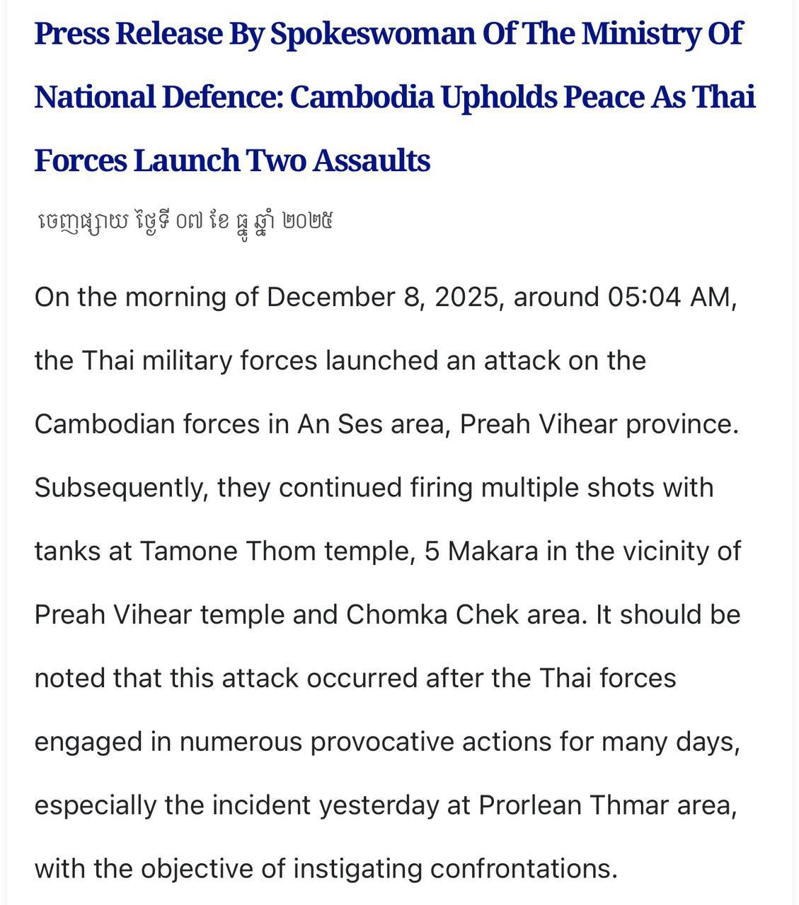 Согласно заявлению министерства национальной обороны Камбоджи, Королевская тайская армия открыла огонь по подразделениям камбоджийской армии в 5:04 утра по местному времени возле Ан Сеса в провинции Преах Вихеар, выпустив несколько выстрелов, включая снаряды из танков, в сторону храма Тамоан Том и района возле храма Преах Вихеар.