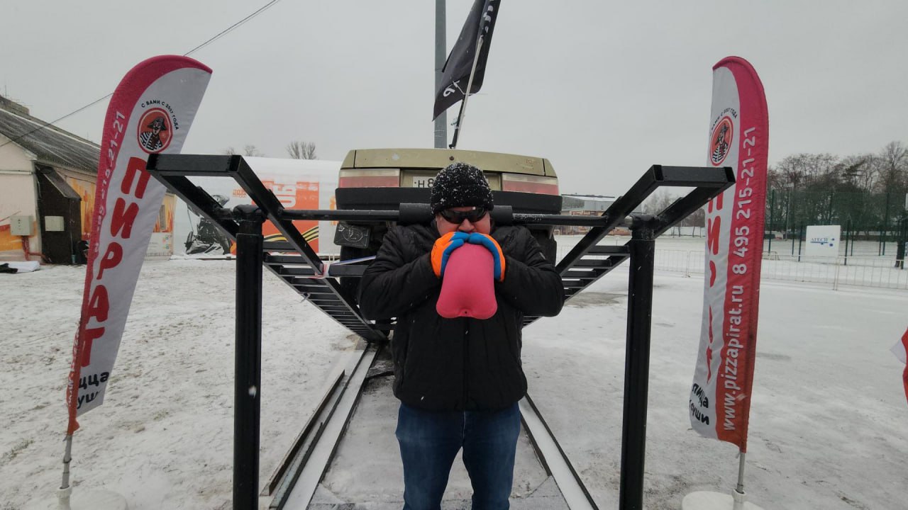 Силач удерживал металлическую платформу с автомобилем весом около тонны и надувал до разрыва резиновые грелки.