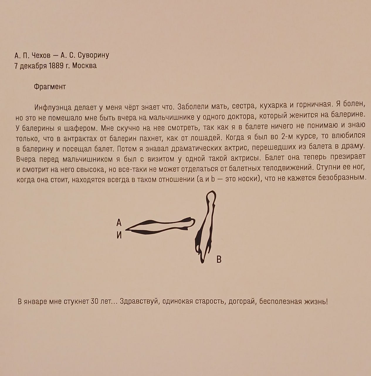 «Инфлуэнца делает у меня чёрт знает что. Заболели мать, сестра, кухарка и горничная. Я болен, но это не помешало мне быть вчера на мальчишнике у одного доктора, который женится на БАЛЕРИНЕ. У балерины я шафером. Мне скучно на нее смотреть, так как я в балете ничего не понимаю и знаю только, что в антрактах от балерин пахнет, как от лошадей.Когда я был во 2-м курсе, то влюбился в балерину и посещал балет. Потом я знавал драматических актрис, перешедших из балета в драму. Вчера перед мальчишником я был с визитом у одной такой актрисы. Балет она теперь презирает и смотрит на него свысока, но все-таки не может отделаться от балетных телодвижений. Ступни ее ног, когда она стоит, находятся всегда в таком отношении (а и b — это носки), что не кажется безобразным». (7 декабря 1889 года)