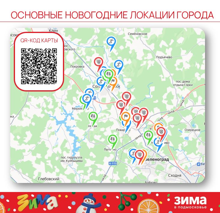 Все мероприятия пройдут с 28 декабря по 11 января. Основные новогодние локации доступны по QR-коду на интерактивной карте.