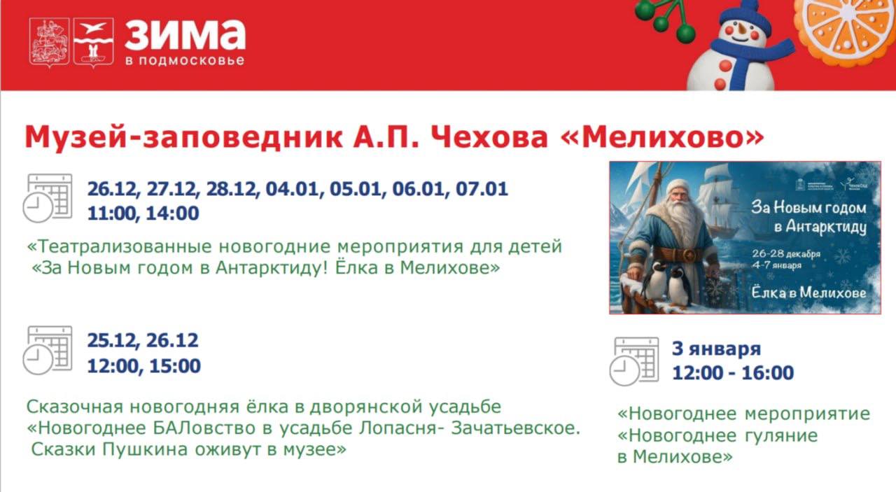 Музей-заповедник А.П. Чехова «Мелихово» проведет театрализованные новогодние елки для детей с 27 декабря по 7 января, а также большое «Новогоднее гуляние в Мелихове» 3 января.