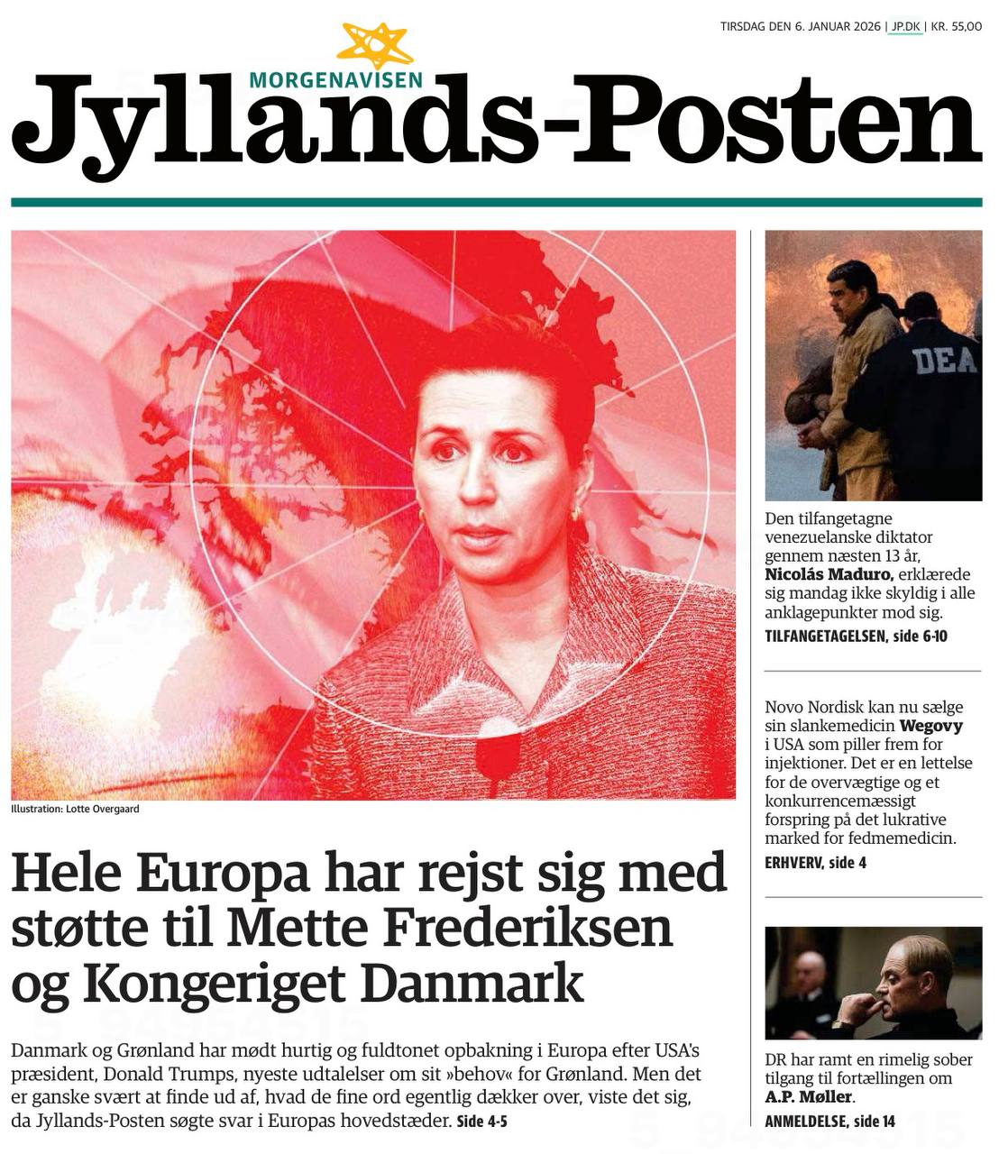 Как я уже писал, забавнее всего сейчас читать датскую прессу, возбужденную наездами Трампа на Гренландию. Сегодняшняя Jyllads-Posten выходит с такой бравурной первой полосой: «Вся Европа выразила поддержку Метте Фредериксен и Королевству Дании». Ну, круто же!