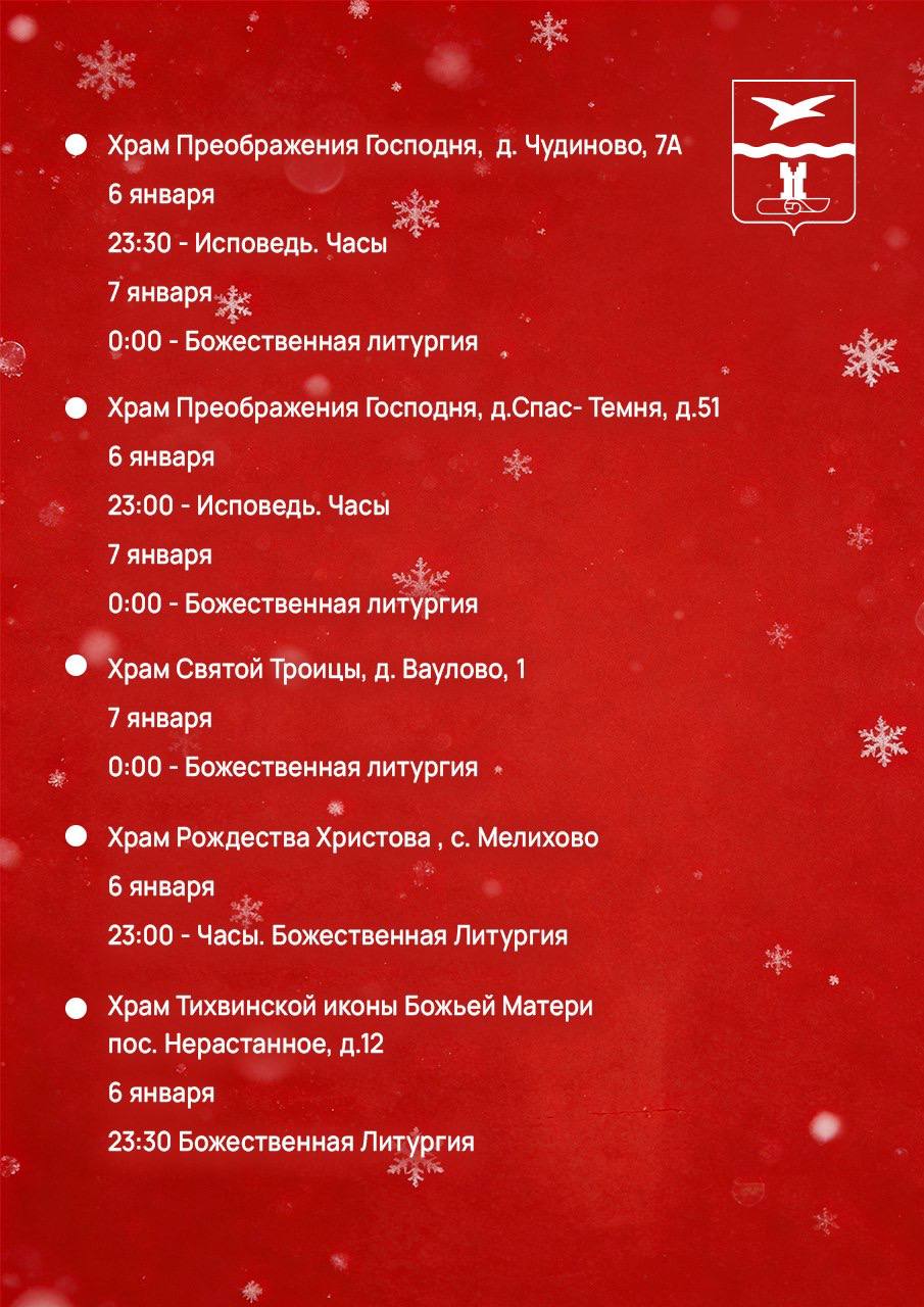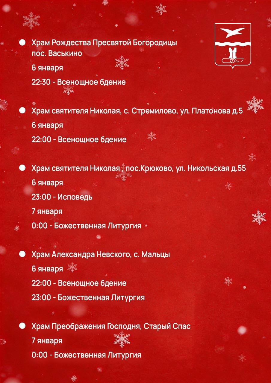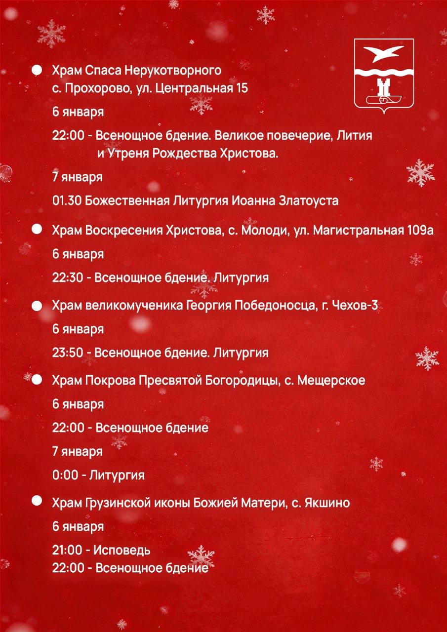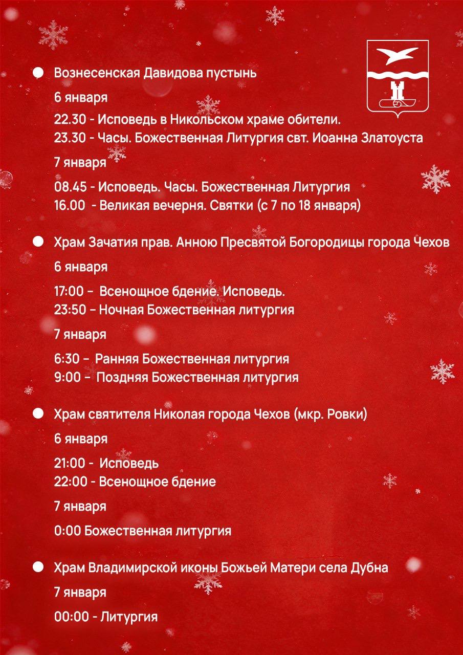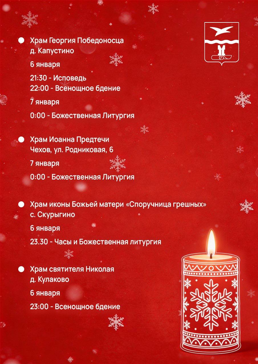 В праздничную ночь в храмах Чеховского благочиния будут служить Божественную Литургию. Богослужения в сочельник отличаются торжественностью. Читаются Царские часы, звучат пророчества о приходе Спасителя и восемь рождественских паремий — выдержек из Священного Писания Ветхого Завета, которые содержат пророчества и прообразы Рождества. Кульминацией службы считается вынос в центр храма зажженной свечи, символизирующей Вифлеемскую звезду, перед которой духовенство поет тропарь и кондак праздника Рождества. Можно спеть их вместе со всеми и пойти домой с совершенно рождественским настроением.