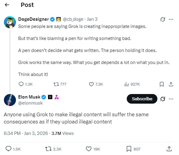 Параллельно регуляторы Великобритании, Индии и Франции уже начали проверки платформы. The Daily Telegraph сообщает, что английское правительство обсуждает возможный запрет Grok на территории королевства.