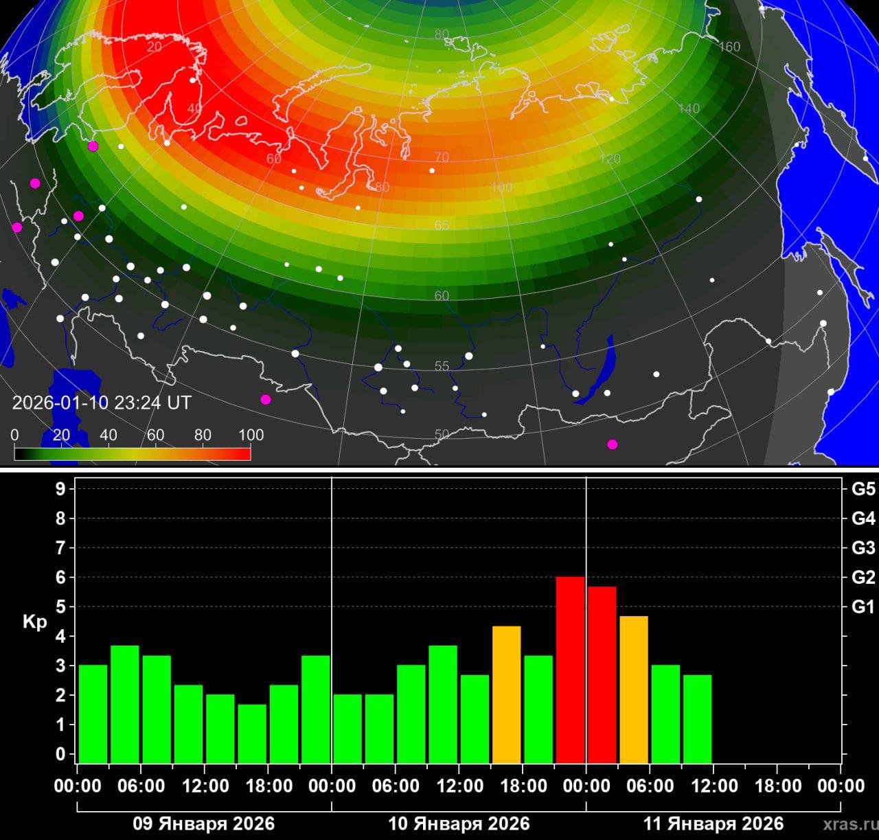 Вторая с начала года магнитная буря с сильными северными сияниями произошла в ночь на 11 января, сообщили в лаборатории солнечной астрономии ИКИ РАН и ИСЗФ СО РАН.