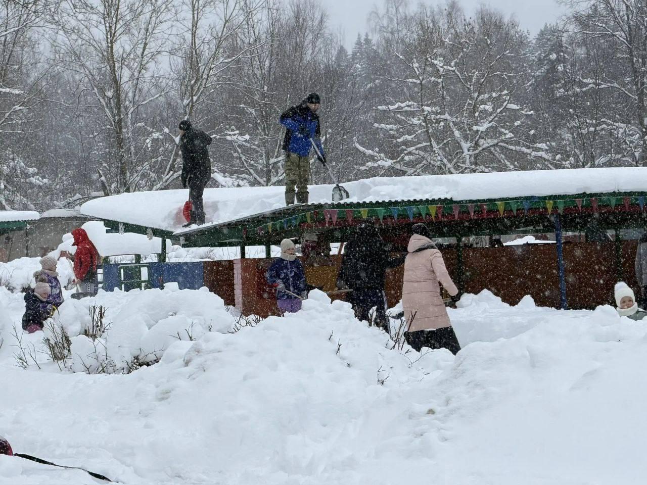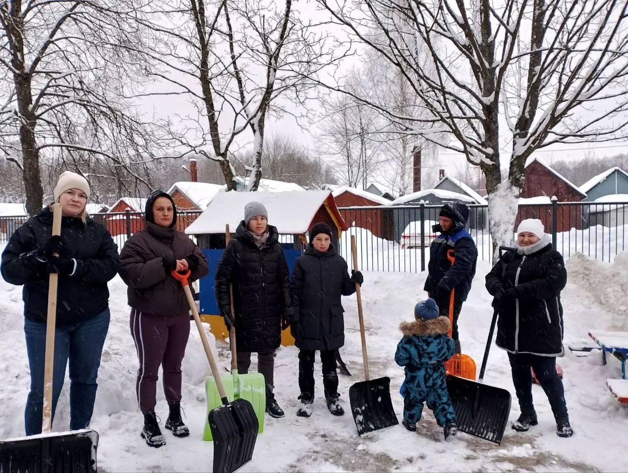 Кто-то аккуратно чистил тропинки, кто-то заботливо сбрасывал снег с крыш навесов, кто-то энергично работал над расчисткой игровых зон. Атмосфера была наполнена радостью и взаимовыручкой. Работа шла быстро и эффективно. Все трудились сообща, помогая друг другу там, где было сложнее всего.