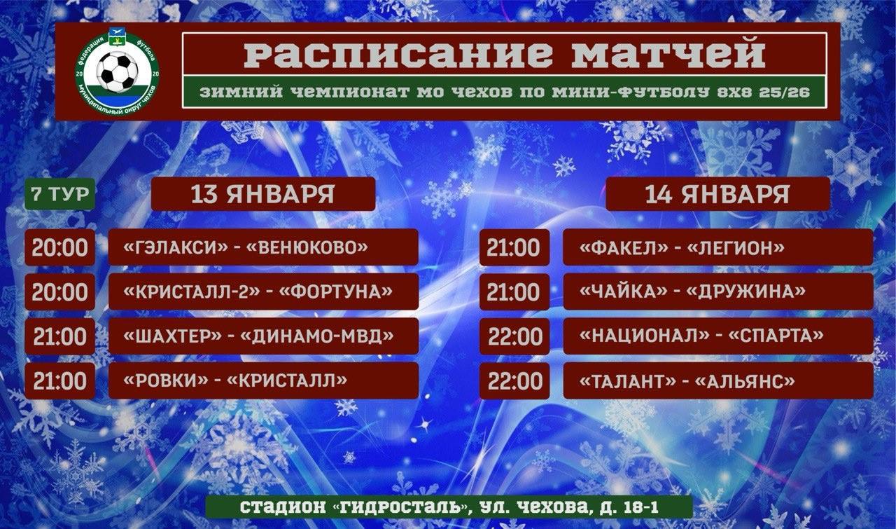 Расписание матчей Зимнего Чемпионата муниципального округа Чехов по мини-футболу сезона 2025/2026, которые пройдут сегодня и завтра