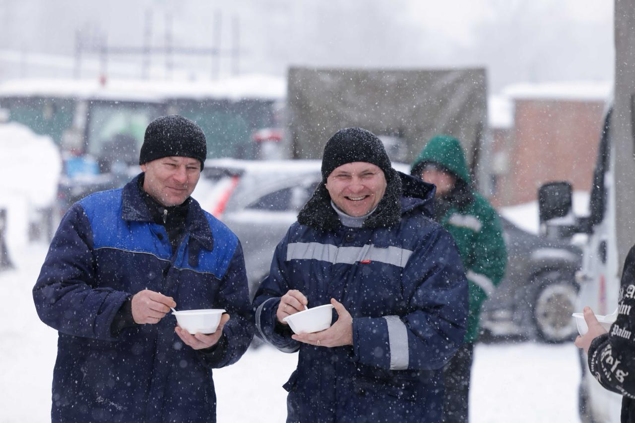 Работы не прекращаются ни днём, ни ночью: коммунальники работают в три смены, водители сменяются - и техника вновь выходит на линию. Сотрудники обеспечены горячим питанием, развёрнута полевая кухня.