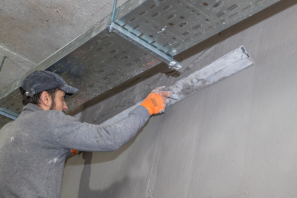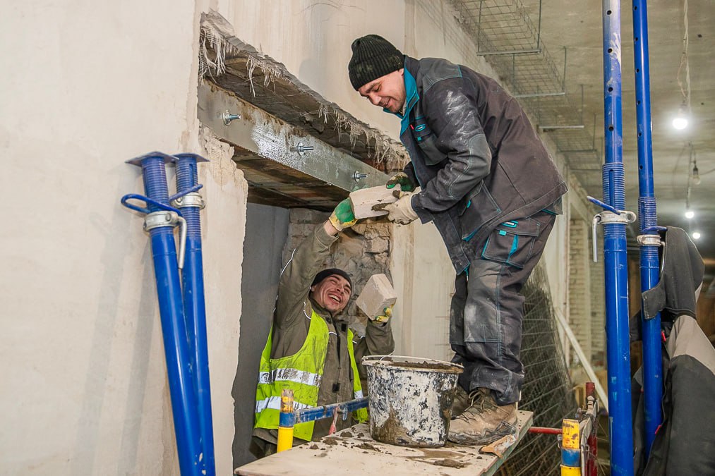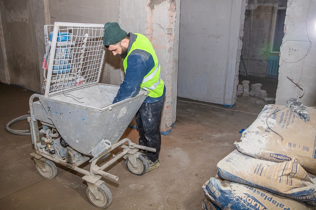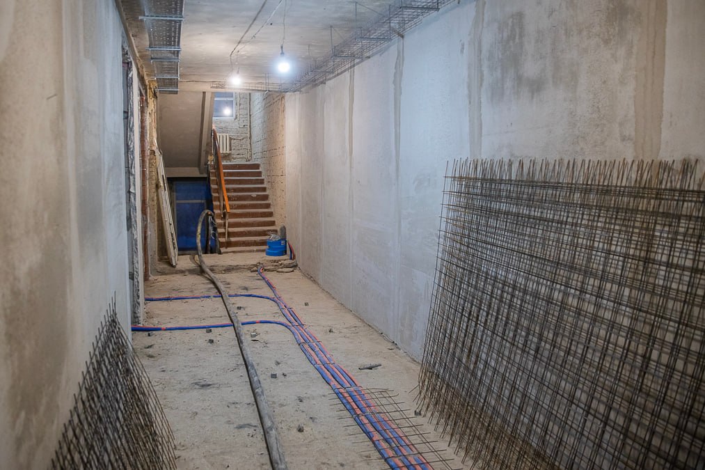 На первом этаже продолжаются кладочные работы, здесь монтируют отопление и штукатурят стены. На втором — делают стяжку. Подрядчик работает с фасадами, входными группами, завершает монтаж лотков для электроснабжения и слаботочных систем. На площадке задействованы 40 специалистов и специальная техника — станции для стяжки и штукатурки.