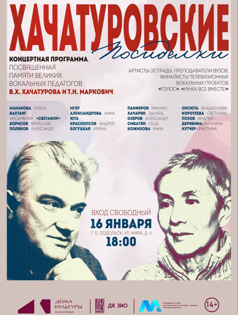 Вечер, посвящённый памяти выдающихся вокальных педагогов — Владимира Христофоровича Хачатурова и Татьяны Николаевны Маркович – пройдёт в Подольске.