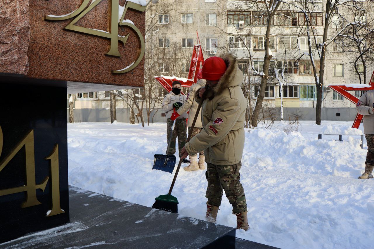 Молодые патриоты дружно вышли на Бульвар Ветеранов, чтобы очистить дорожки, тротуары и памятник.