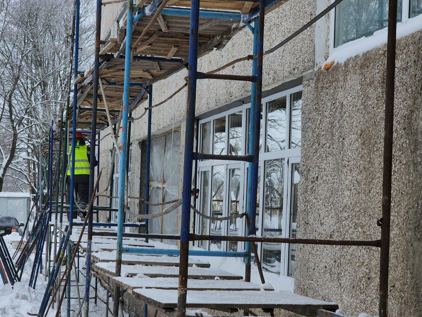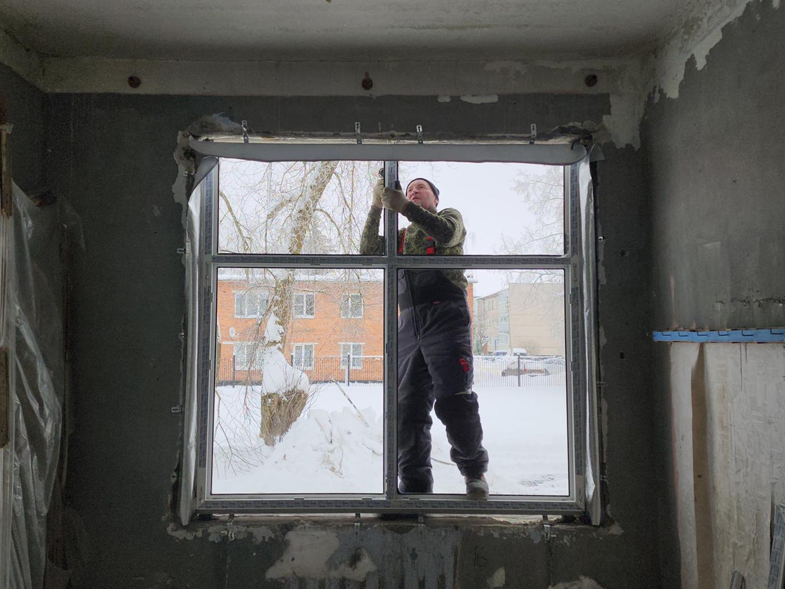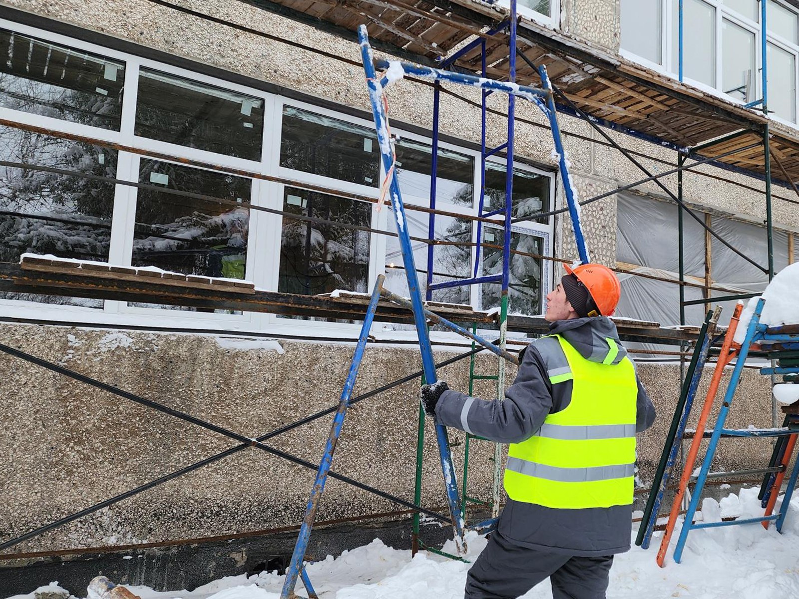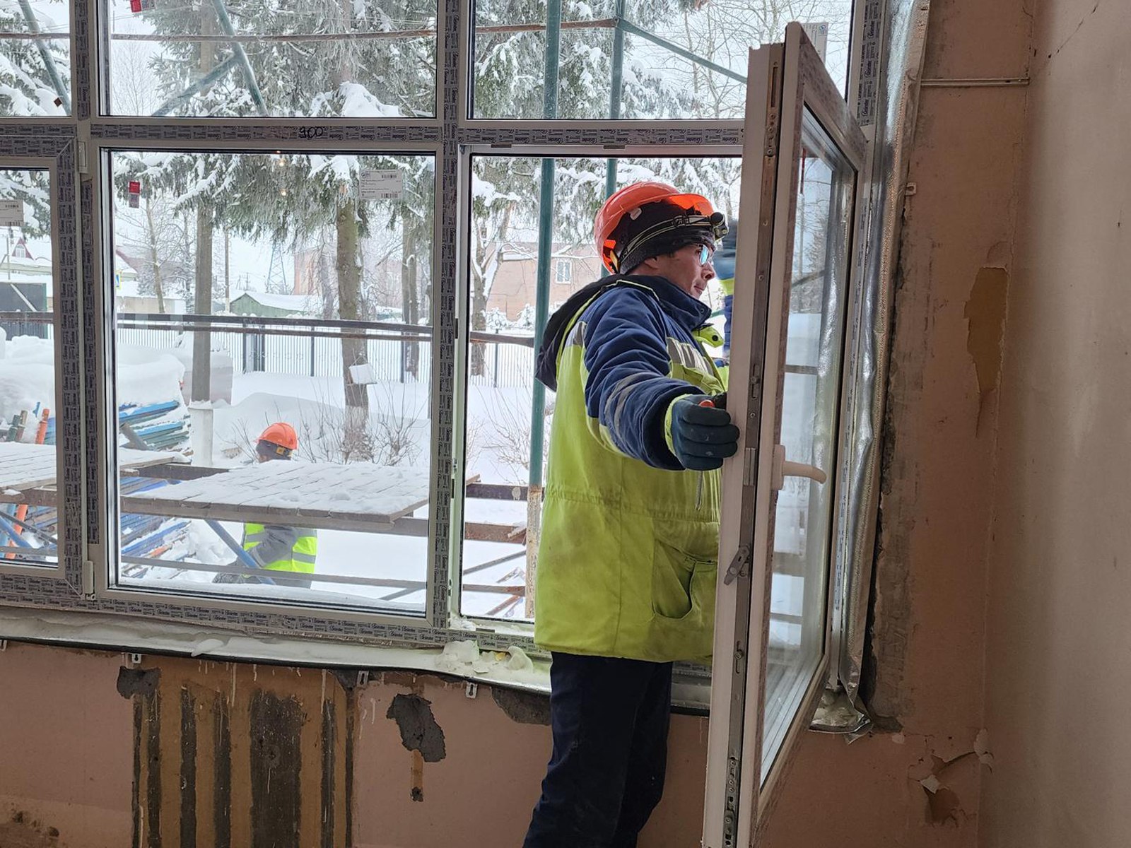 На объекте кипит работа: мастера монтируют кровлю и устанавливают пластиковые окна. Чтобы успеть в срок, на площадке ежедневно трудится более 30 человек, включая кровельщиков и монтажников. Здание, построенное в 1971 году, фактически получает второе рождение.