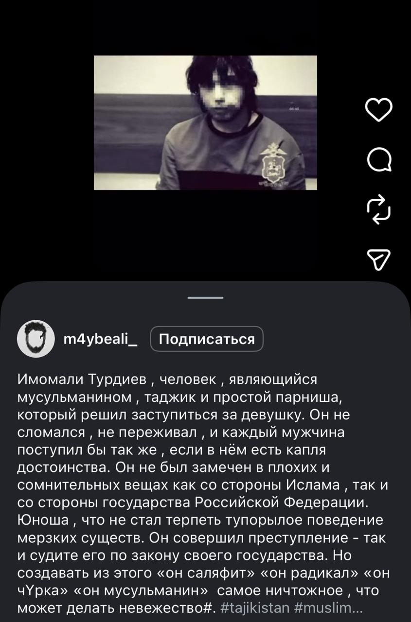 Ваххабиты в халяльной инсте включили прогрев за тожероссиянина Имомали Турдиева, который несколькими ножевыми ударами зарезал 18-летнего парня в подмосковном автобусе.