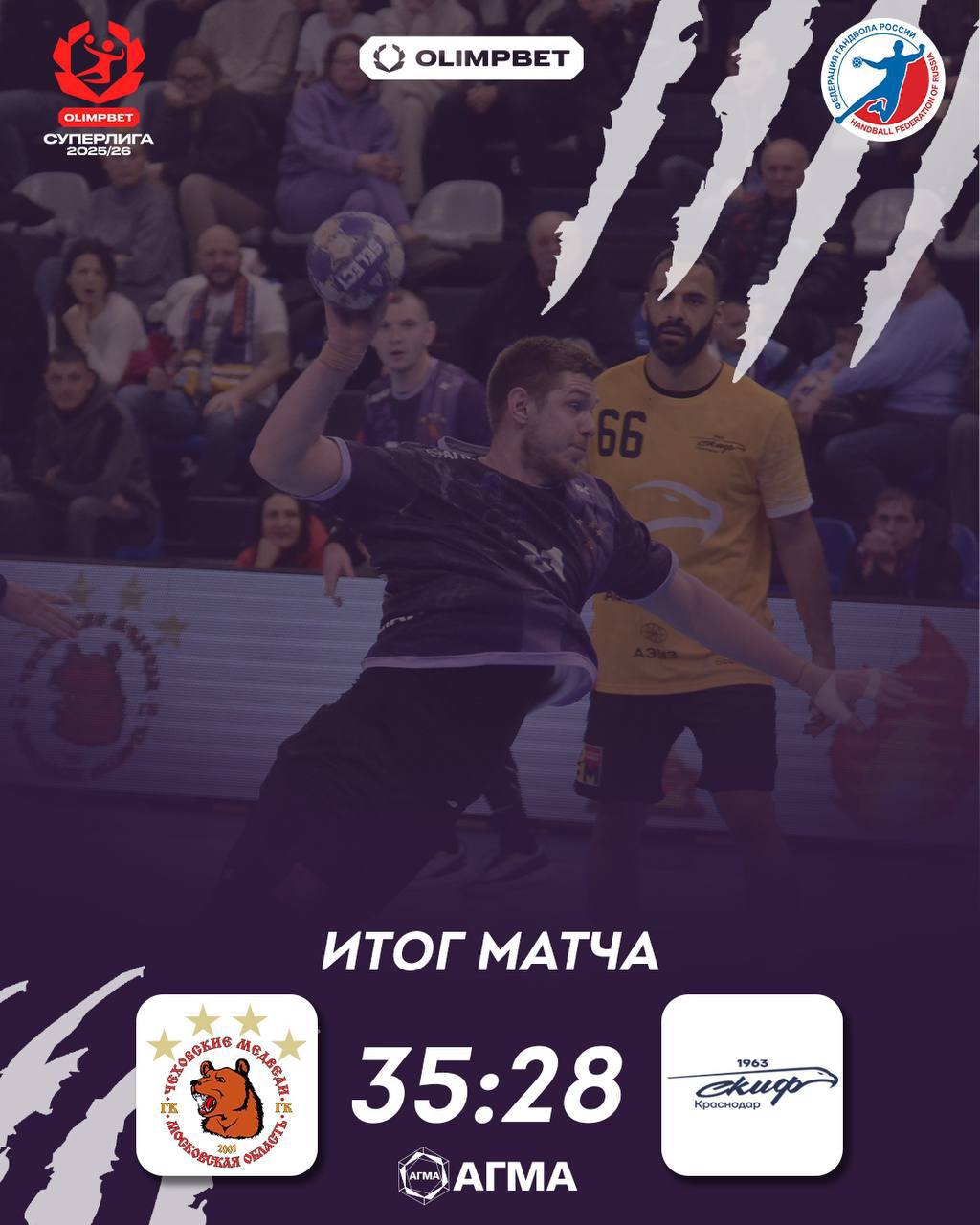 Сегодня, 25 января, «Чеховские медведи» провели домашнюю встречу OLIMPBET Суперлиги чемпионата России по гандболу против краснодарской команды СКИФ. Матч завершился уверенной победой подмосковных гандболистов – 35:28 (18:16).