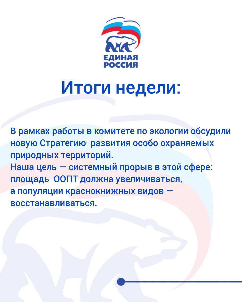 В рамках работы в комитете по экологии обсудили новую Стратегию развития особо охраняемых природных территорий. Наша цель — системный прорыв в этой сфере: площадь ООПТ должна увеличиваться, а популяции краснокнижных видов — восстанавливаться; жесткий надзор и современный мониторинг; умное регулирование. Необходимо пресекать незаконную застройку, свалки, попытки «подвинуть» границы заповедников. Для этого нужно внедрить систему фонового экологического мониторинга — это будет технический «глаз и ухо» для охраны природы. Отсутствие правил вредит больше, чем разумное развитие.