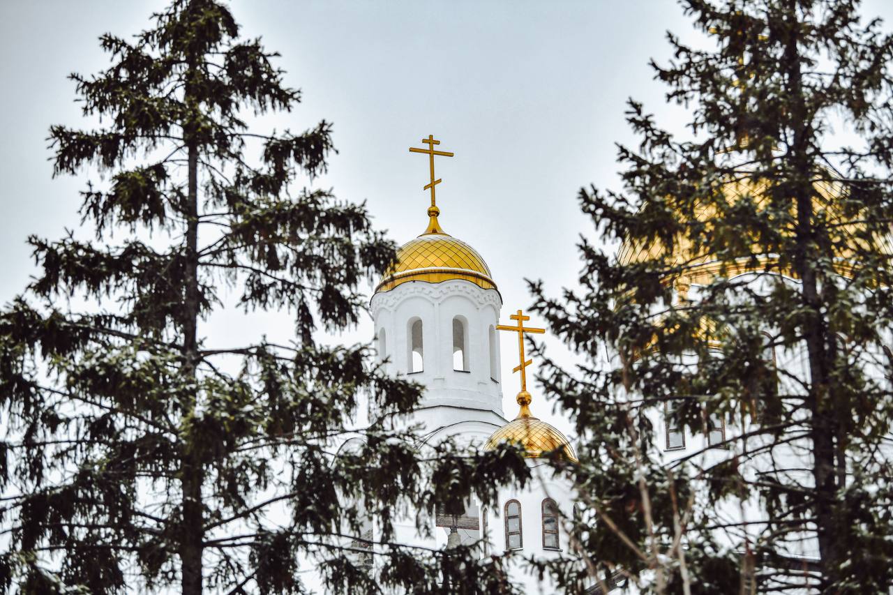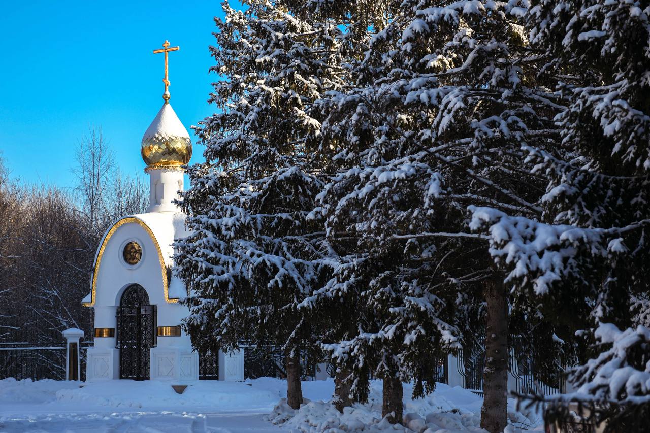 Просторные дорожки среди заснеженных деревьев, ухоженная территория вокруг храма с удобными лавочками, архитектурные детали храма, особенно выразительные зимой.