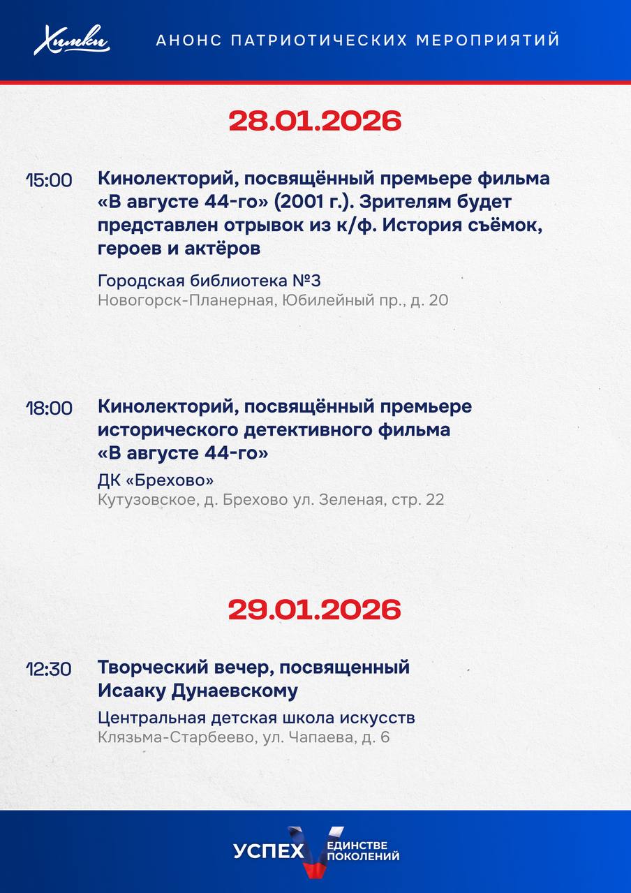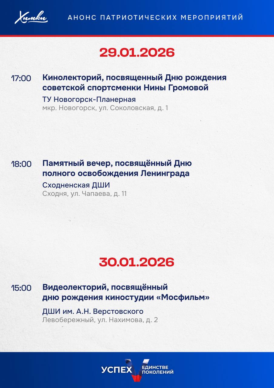 11:00 – «Симфония Мужества». Патриотический час, посвящённый Дню полного освобождения Ленинграда от фашистской блокады. ДК мкр. Юбилейный. 6+12:00 – «Мастерилка». Мастер-класс по изготовлению поделок из подручных материалов. Библиотека №8. 6+15:00 –...