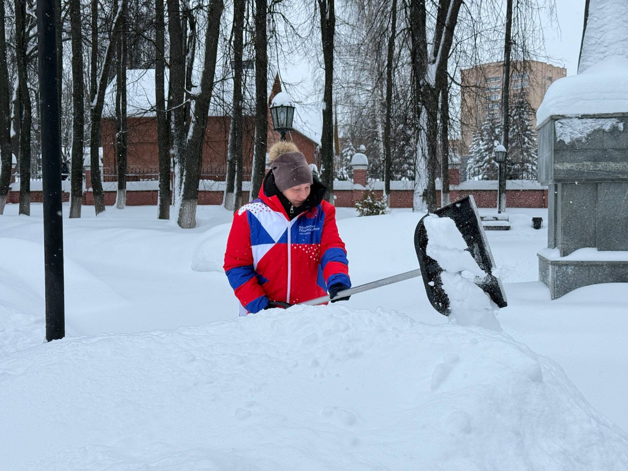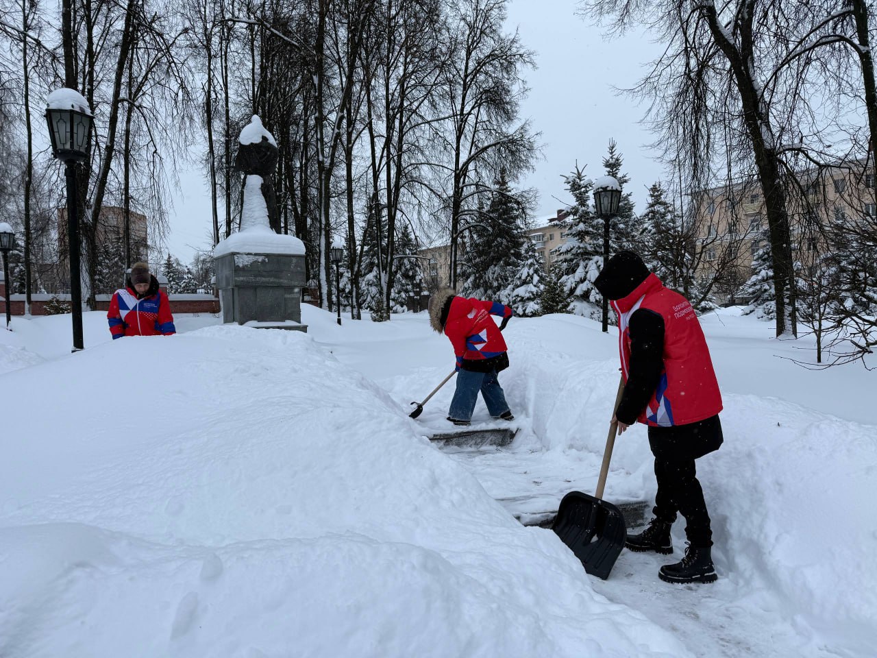 Активисты вместе с сотрудниками «Чистого города» расчищают дорожки на мемориале Воинской славы «Вечный огонь» и проезжую часть на улице Литейная у клуба «Стекольный».
