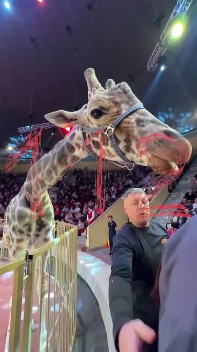 Во время шоу жираф наклонился к зрительнице и облизал её губы.