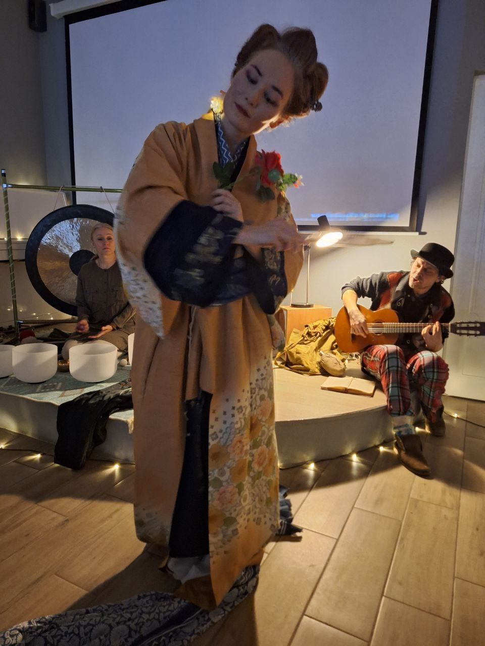 Музыка и песни Саши Сазонова, гонг, хрустальные чаши и вокал Анжелики Карамагдесян, чайная церемония Макарии Косухиной, философские рассуждения Кенко Хоси погрузили зрителей в невероятную атмосферу покоя души и «Страны восходящего солнца».