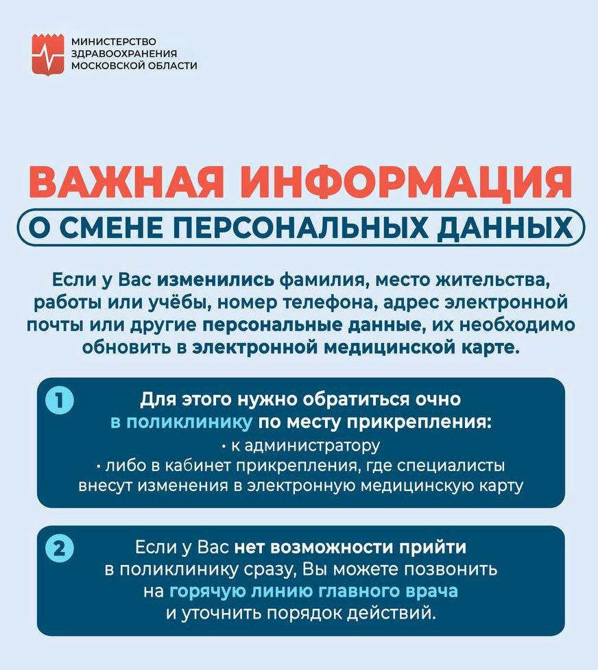 Уважаемые пациенты! Если у вас изменились персональные данные, такие как: фамилия, место жительства, место работы или учёбы, номер телефона, адрес электронной почты
