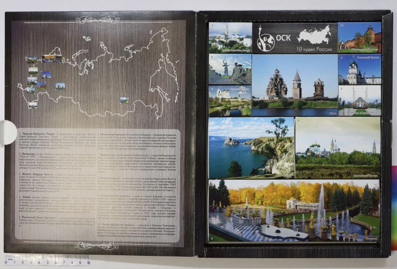 Набор 10 чудес России представляет собой оригинальную обложку и включает себя спички разных видов, от каминных до охотничьих, в отдельных коробках. На лицевых сторонах спичечных коробков изображены природные и архитектурные достопримечательности России. Коробок 9 украшен видом коломенского кремля и содержит так называемые кабинетные спички более длинные, чем привычные бытовые.