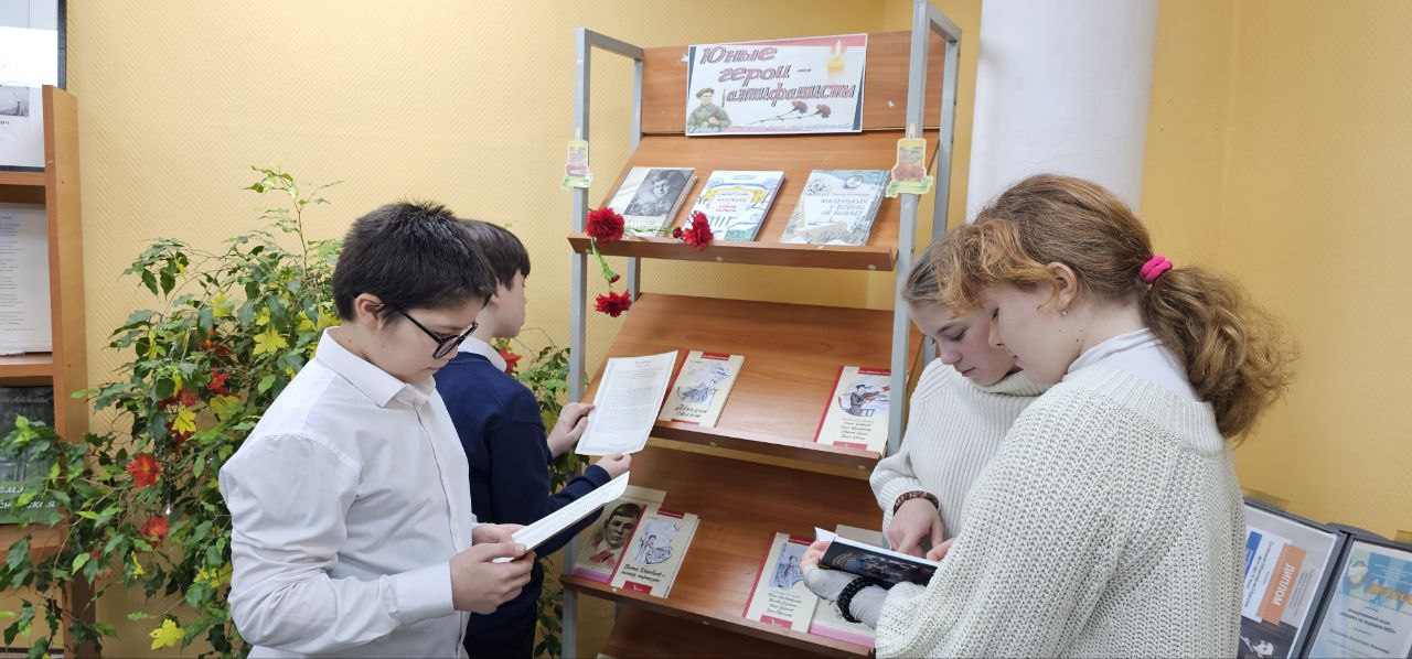 Ежегодно 8 февраля мир отмечает День юного героя-антифашиста. Выбор сделан неслучайно. В разных странах мира именно в этот день гибли юные герои, участвующие в борьбе против фашизма. Ведущий рассказал ребятам о мальчишках и девчонках, которые за подвиги, совершённые в годы Великой Отечественной войны, были удостоены самой высокой награды Родины - звания Героя Советского Союза. Школьники с интересом слушали рассказ о своих ровесниках: Лёне Голикове, Зине Портновой, Марате Казее, Вале Котике и других пионерах-героях, чей подвиг навеки останется в памяти поколений. Рассказ сопровождался показом электронной презентации «Дети-герои» и обзором книг, представленных на выставке-подвиге «День юного героя-антифашиста». Дети познакомились с произведениями Сергея Алексеева, серией книг о пионерах-героях, сборниками о Великой Отечественной войне и другими материалами. Хочется верить, что в памяти ребят навсегда останутся имена юных солдат, с биографиями которых они познакомились на мероприятии.