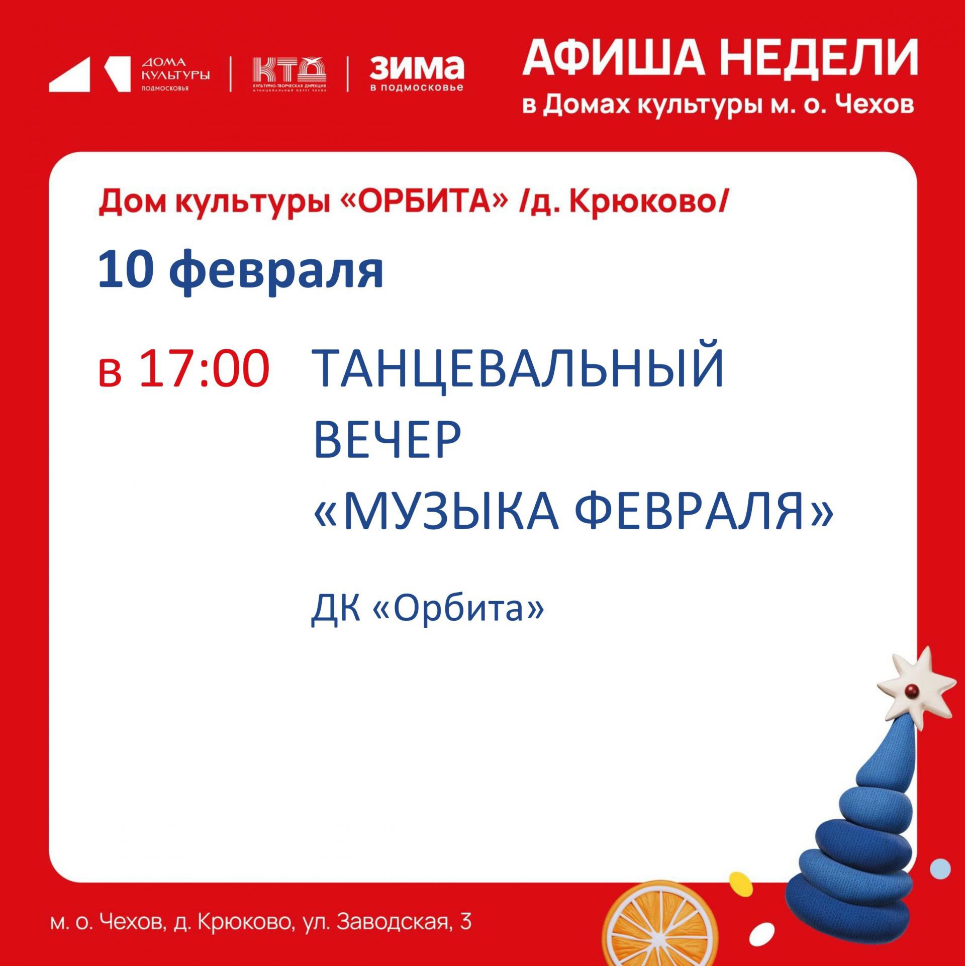 Уважаемые гости и жители д.Крюково приглашаем вас на танцевальный вечер Музыка февраля , которое будет проходить 10 февраля в 17:00