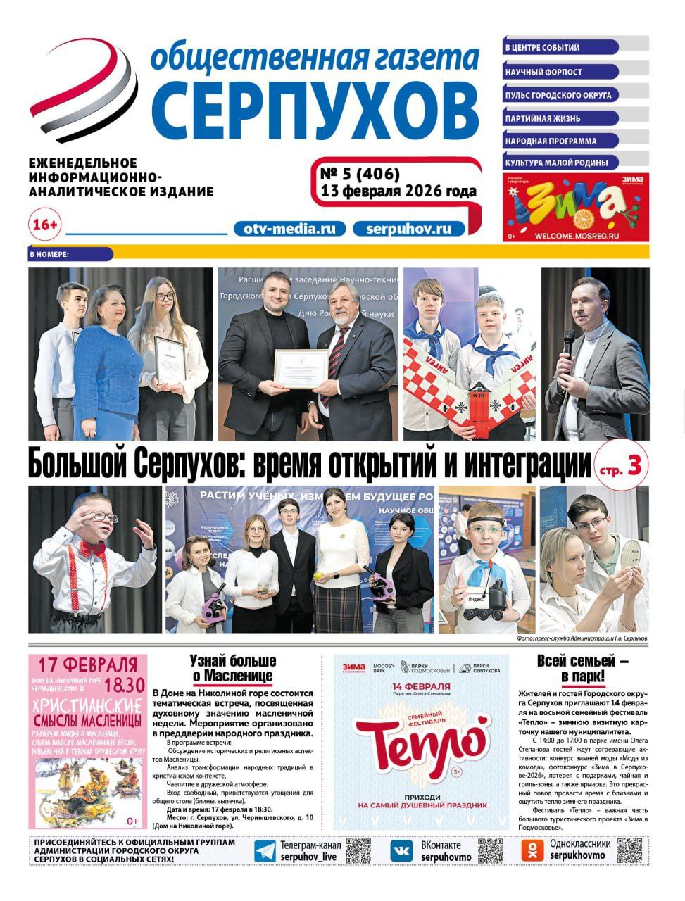 О самых интересных событиях Городского округа Серпухов читайте в новом номере «Общественной газеты – Серпухов» № 5 от 13.02.2026: