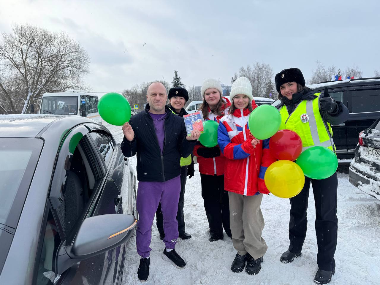 В этот предпраздничный день волонтёры вручали водителям шарики, брошюру с правилами дорожного движения и искренние пожелания отличного настроения и безопасных дорог!