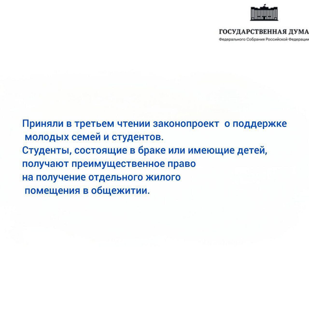 Принят законопроект, согласно которому студенческие семьи теперь имеют право на отдельную комнату в общежитии. Раньше молодые пары часто не могли жить вместе из-за нехватки мест. Теперь этот барьер убран.