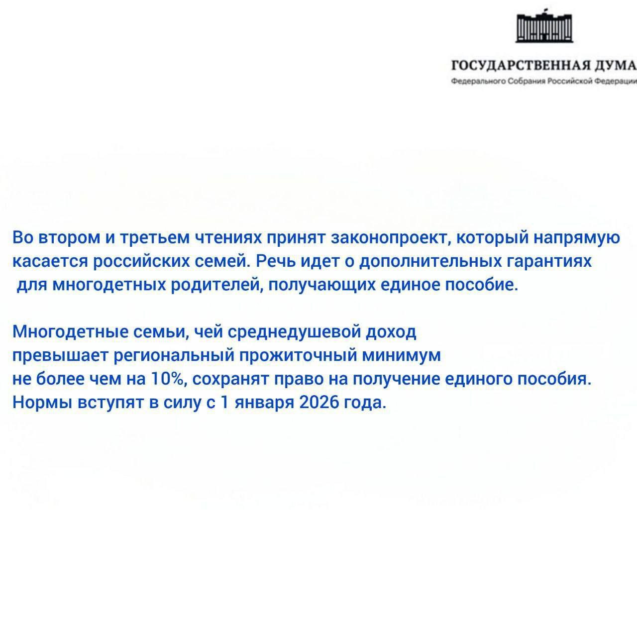 Многодетные семьи не лишатся пособия, если заработали чуть больше прожиточного минимума. Президент поддержал, мы приняли закон. С 2026 года порог повышается на 10%.