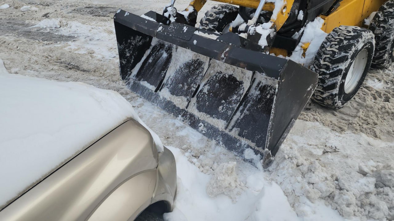 Буквально за несколько минут погрузчик-экскаватор расчистил машине дорогу. Девушке осталось только почистить стекла и фары от снега и наледи.