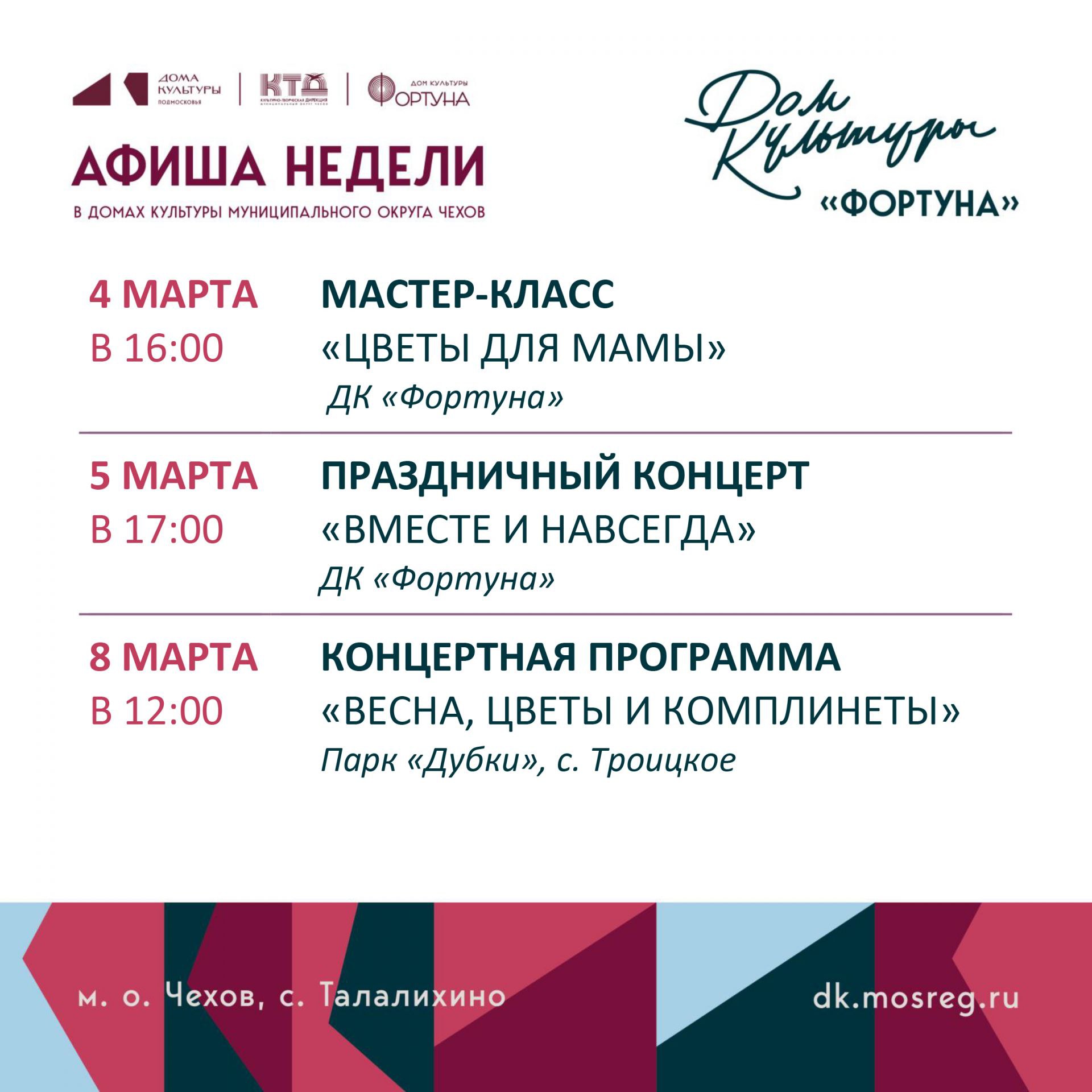 Афиша на неделю ДК «Фортуна» м.о. Чехов