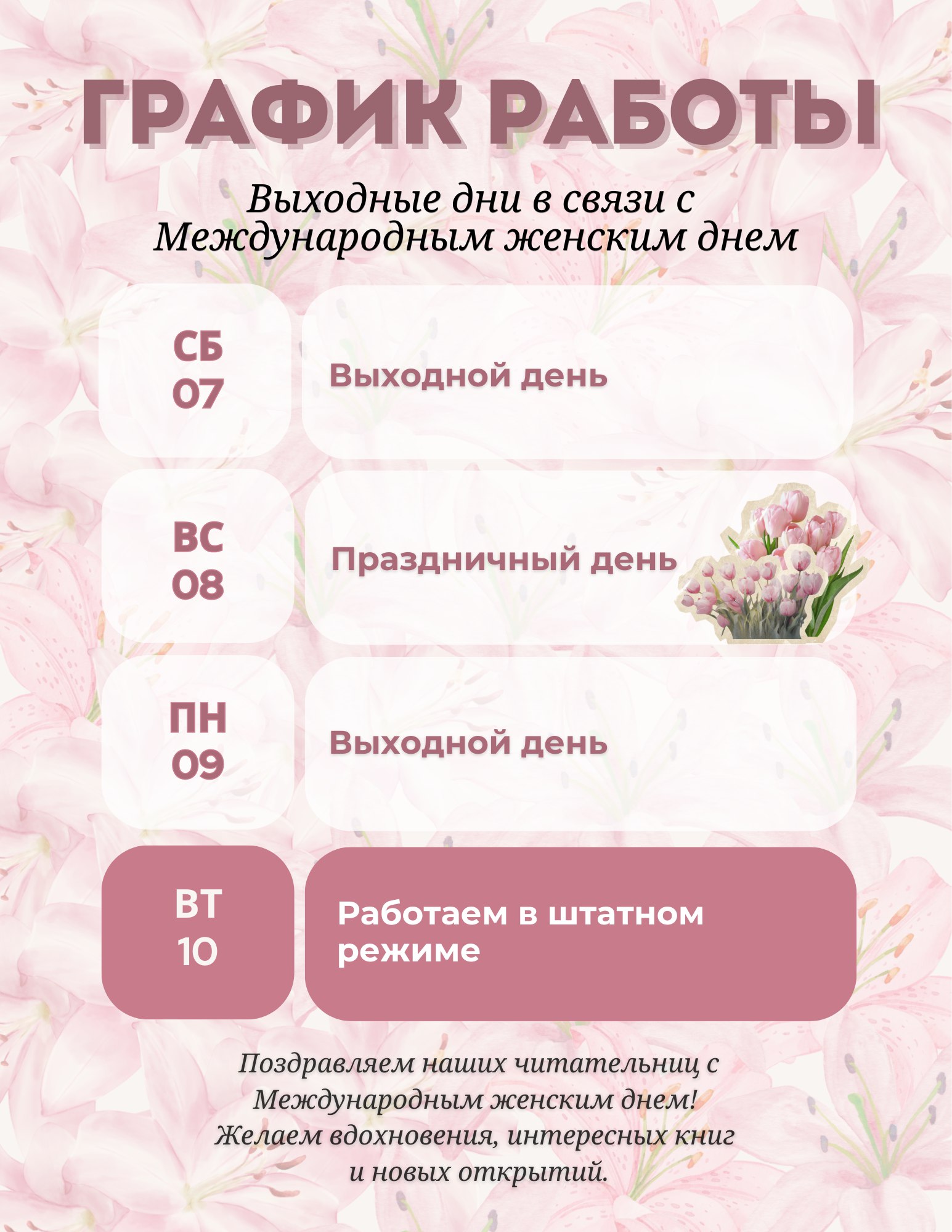 Уважаемые читатели! Обращаем ваше внимание на график работы Городской библиотеки №1 в период с 07.03.2026 по 09.03.2026