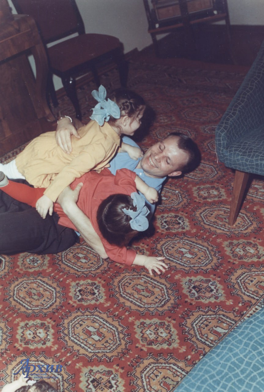 На фото: Первый космонавт планеты Земля Ю.А.Гагарин в своей квартире, играет с дочерями Леной (слева) и Галей (1); Первый космонавт планеты Земля, Герой Советского Союза, лётчик-космонавт СССР, майор Ю.А.Гагарин перед одной из своих многочисленных встреч (2); Первый космонавт планеты Земля Ю.А.Гагарин на одной из бензозаправок в Московской области (3); Первый космонавт планеты Земля Ю.А.Гагарин и его жена В.И.Гагарина с младшей дочкой Галиной на отдыхе (4); Первый космонавт планеты Земля Ю.А.Гагарин и его жена В.И.Гагарина, на территории Зелёного городка (5).