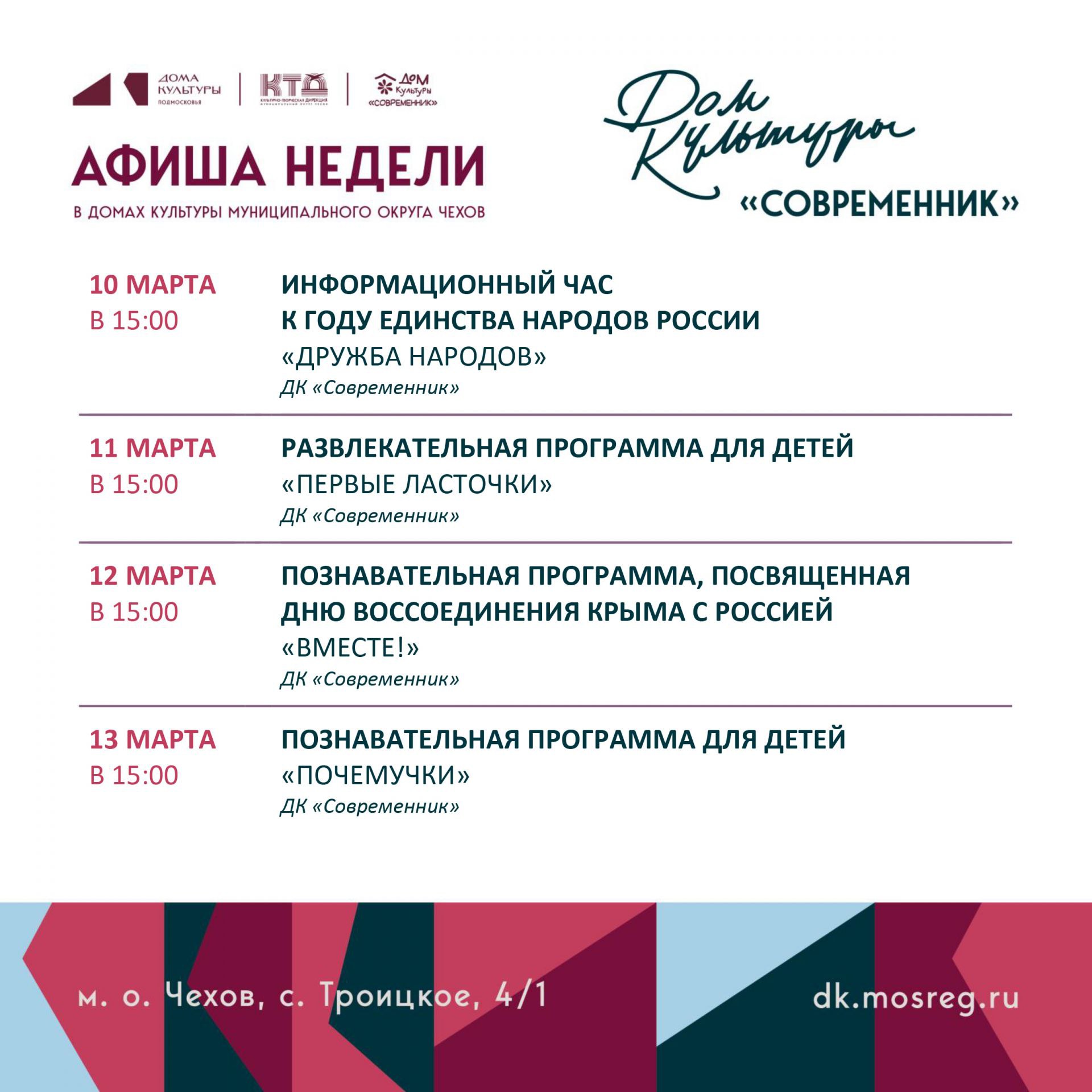 Афиша недели ДК «Современник» м.о. Чехов