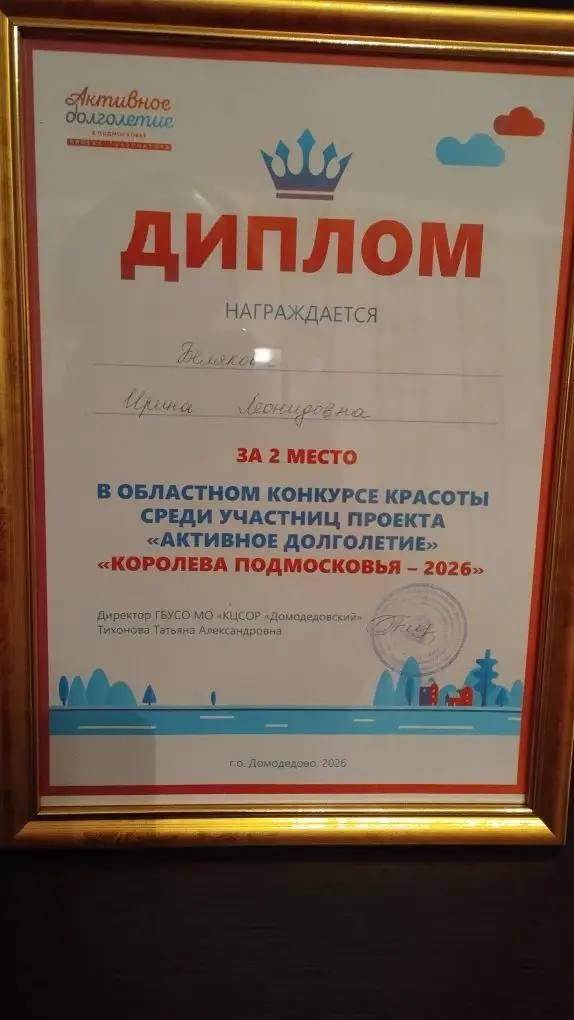 Ирина Леонидовна - одна из самых активных и талантливых участников программы «Активное долголетие в Подмосковье». Является призером областных конкурсов «Серебряные виртуозы», «Миссис Активное долголетие». Ирина прекрасный организатор творческих программ, которые с успехом проходят в клубе активного долголетия.