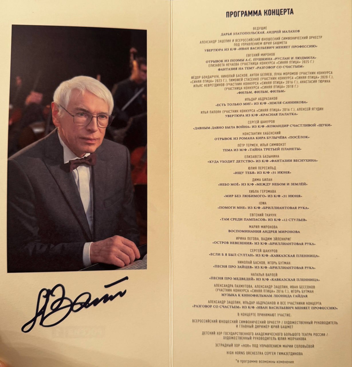 В сопровождении Всероссийского юношеского симфонического оркестра под управлением народного артиста СССР Юрия Башмета на сцену вышли Евгений Миронов, Сергей Шакуров, Наталья Варлей, Константин Хабенский, Федор Бондарчук, а также эстрадные исполнители. Особые овации вызвало появление народной артистки СССР, композитора Александры Пахмутовой.
