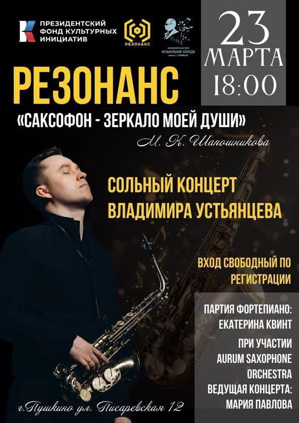 Автор и мастер проекта "Резонанс", главный идейный вдохновитель и организатор конкурса саксофонистов "Прокофьев-САКС!", солист Санкт-Петербургского Дома музыки Владимир Андреевич Устьянцев выступит в Московском областном музыкальном колледже имени С.С. Прокофьева (г. Пушкино, ул. Писаревская, д. 12).