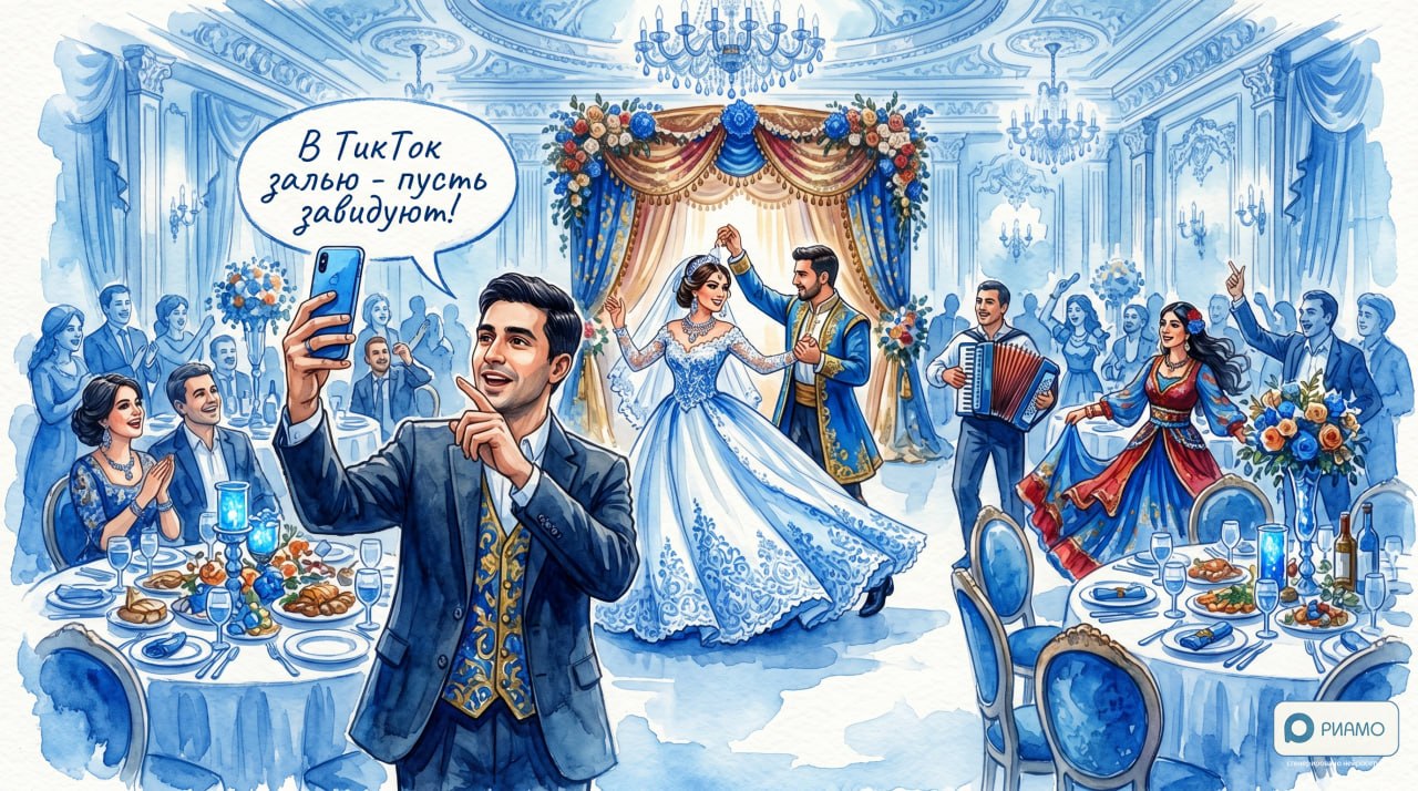 Отдельную роль играют традиционные обряды. Так, на видео можно увидеть, как молодоженов осыпают деньгами в качестве пожелания достатка и благополучия. Сотни гостей активно участвуют в торжестве: танцуют, поют, поздравляют жениха и невесту, оставляя щедрые подарки, а само празднование нередко превращается в непрерывное застолье с чередой тостов и музыкальных номеров.