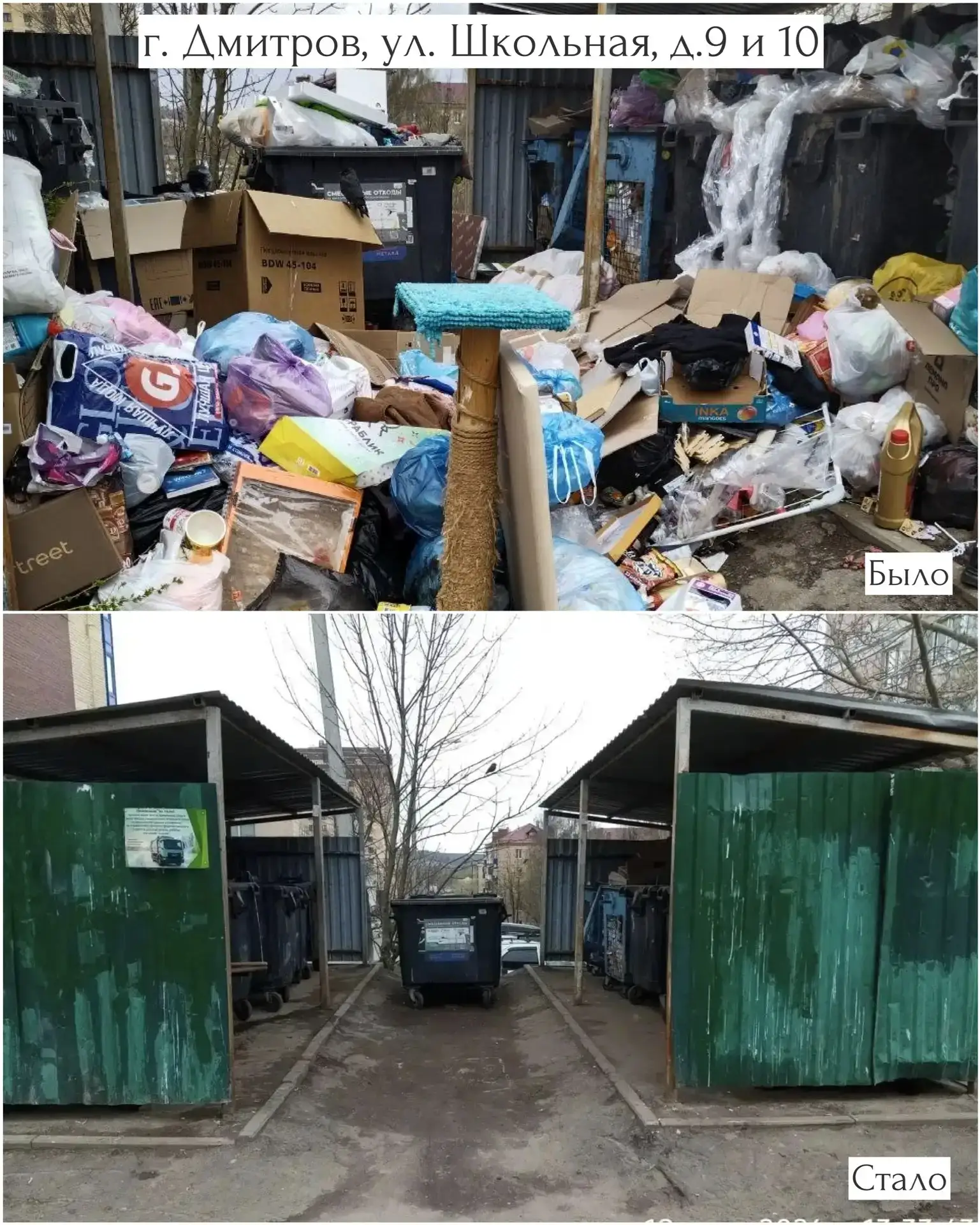 г. Дмитров, ул. Школьная, д. 9 и 10 — вывезен скопившийся мусор, контейнерная площадка очищена.