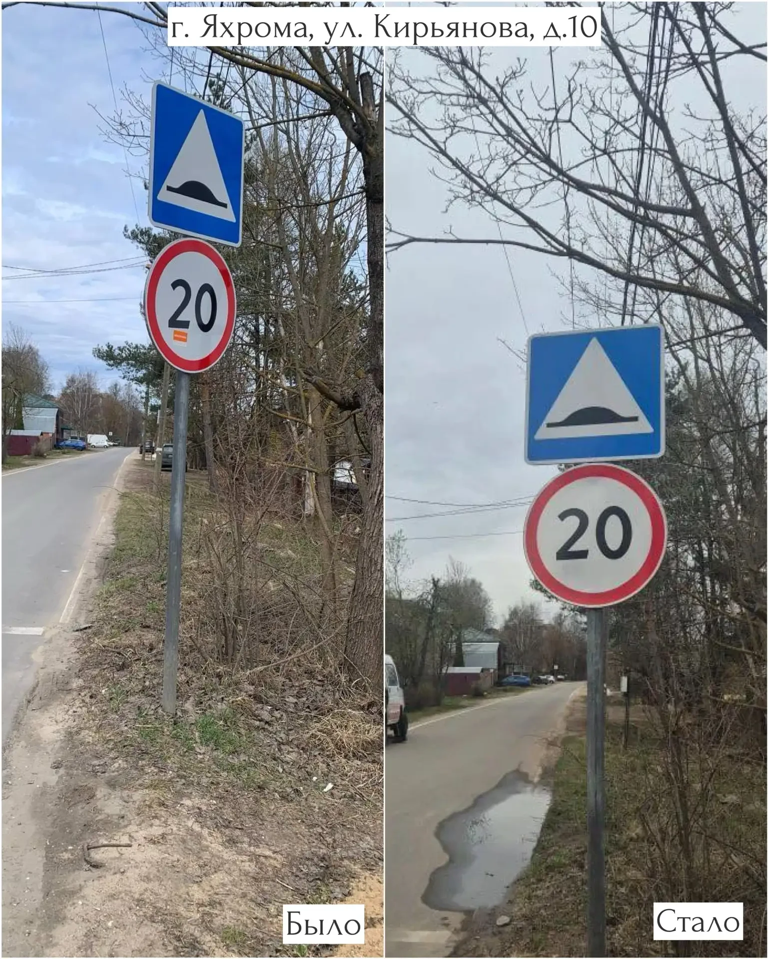 г. Яхрома, ул. Кирьянова, д. 10 — специалистами Управления автомобильных дорог произведено укрепление опоры дорожного знака.