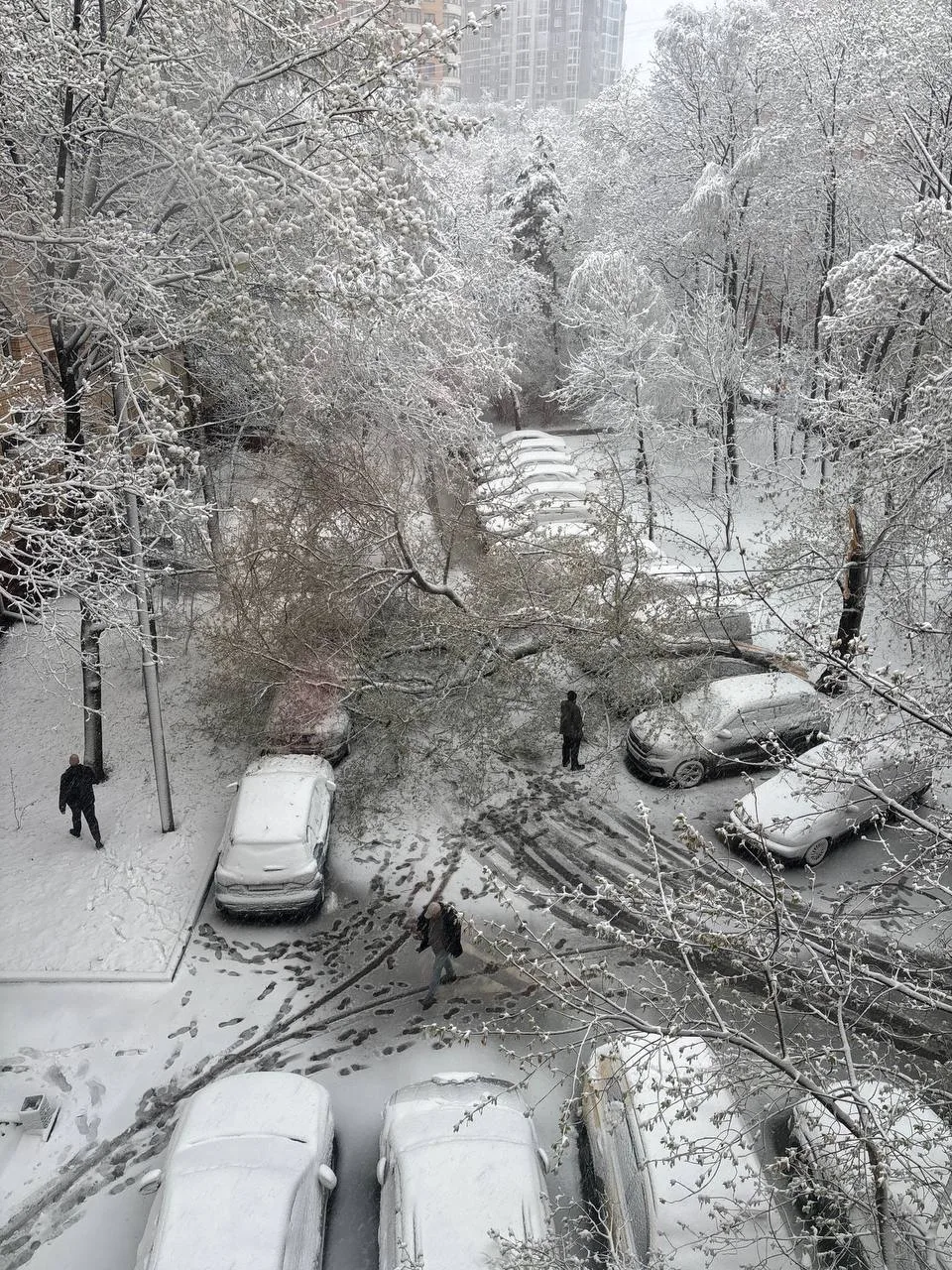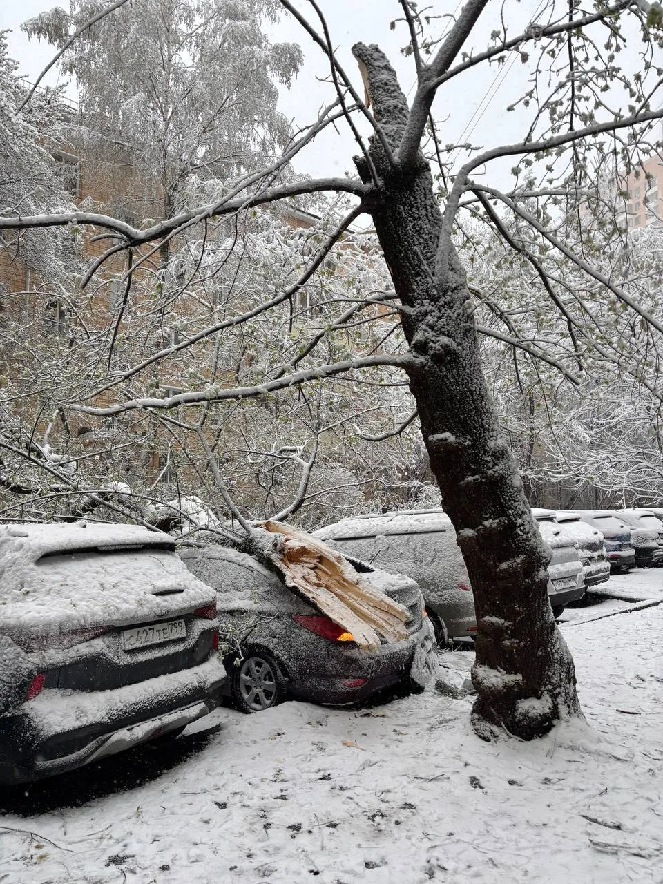 Некоторые деревья из-за снегопада упали на припаркованные авто в Москве и Подмосковье. Непогода продлится до завтрашнего вечера