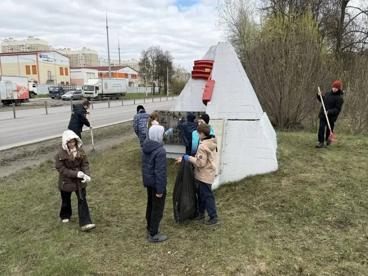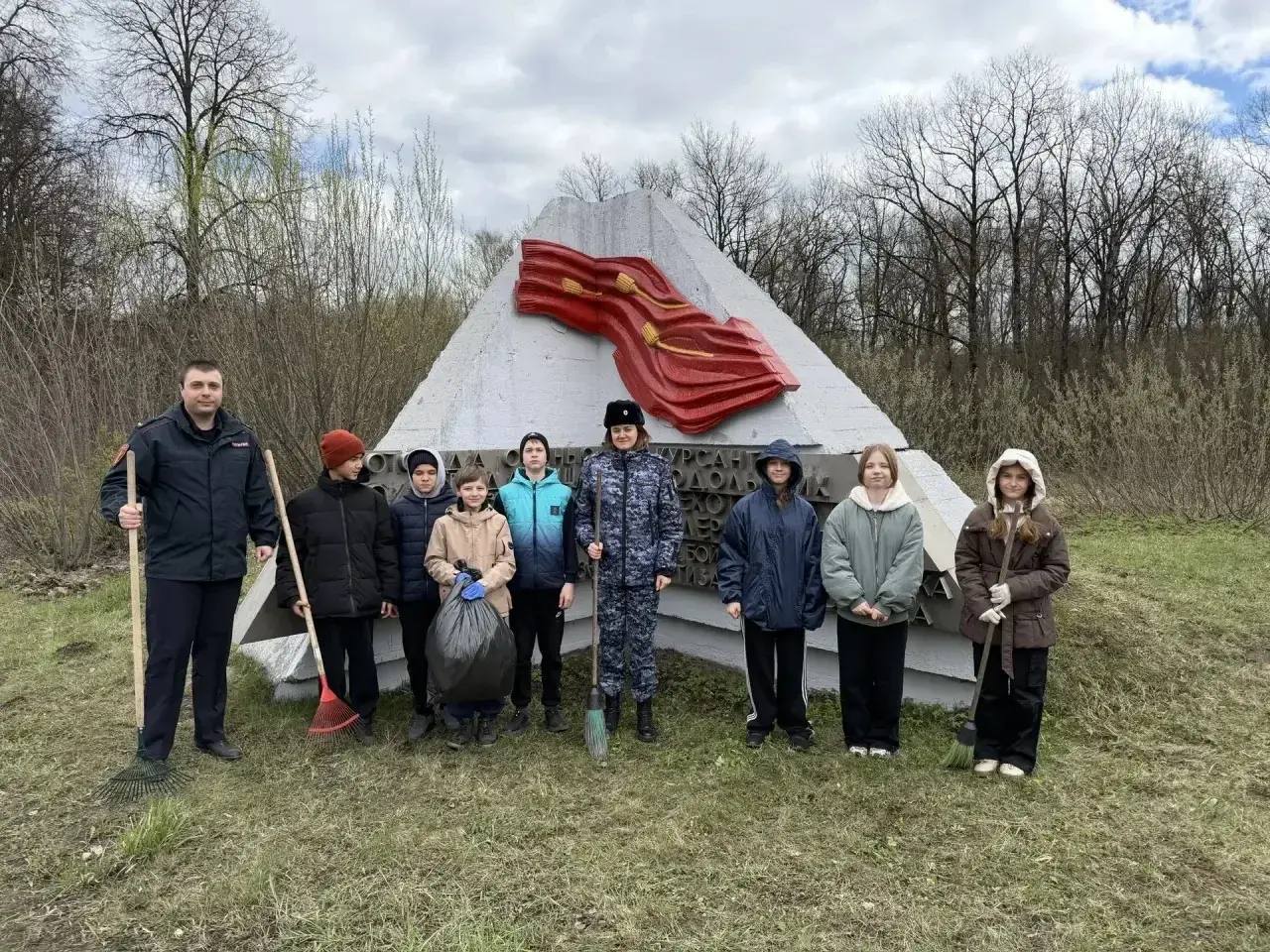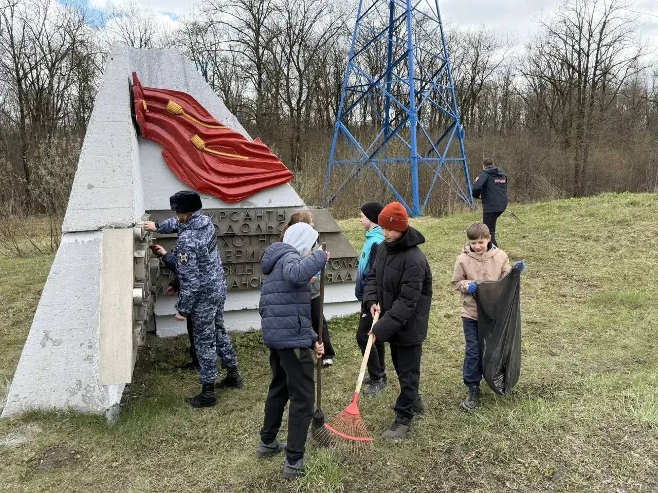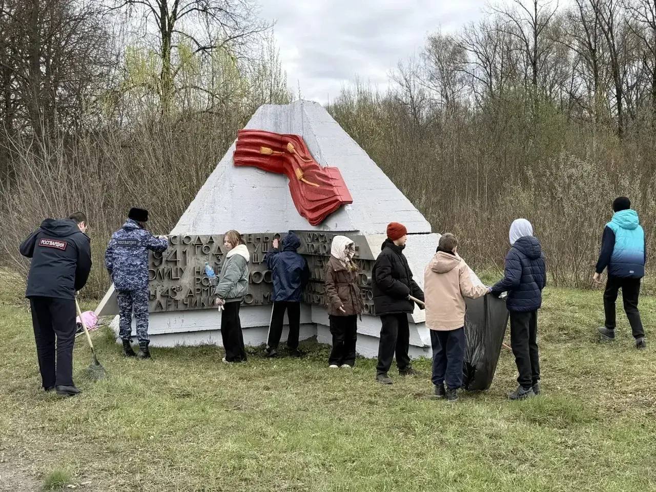 На субботнике кадеты вместе с росгвардейцами приводили в порядок территорию вокруг мемориала: убирали прошлогоднюю листву, собирали ветки и наводили чистоту.