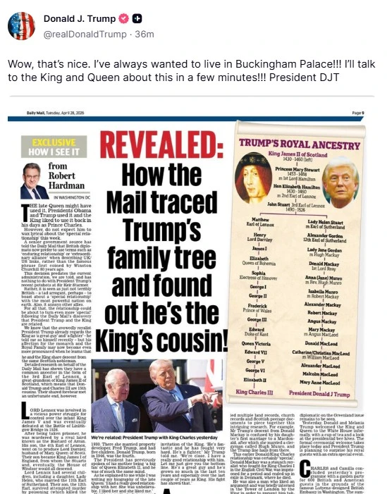 ‘Ух ты, это здорово! Я всегда мечтал жить в Букингемском дворце! Я поговорю об этом с королем и королевой через несколько минут!’ – Трамп отреагировал на сообщения СМИ о том, что он и король Чарльз дальние родственники.