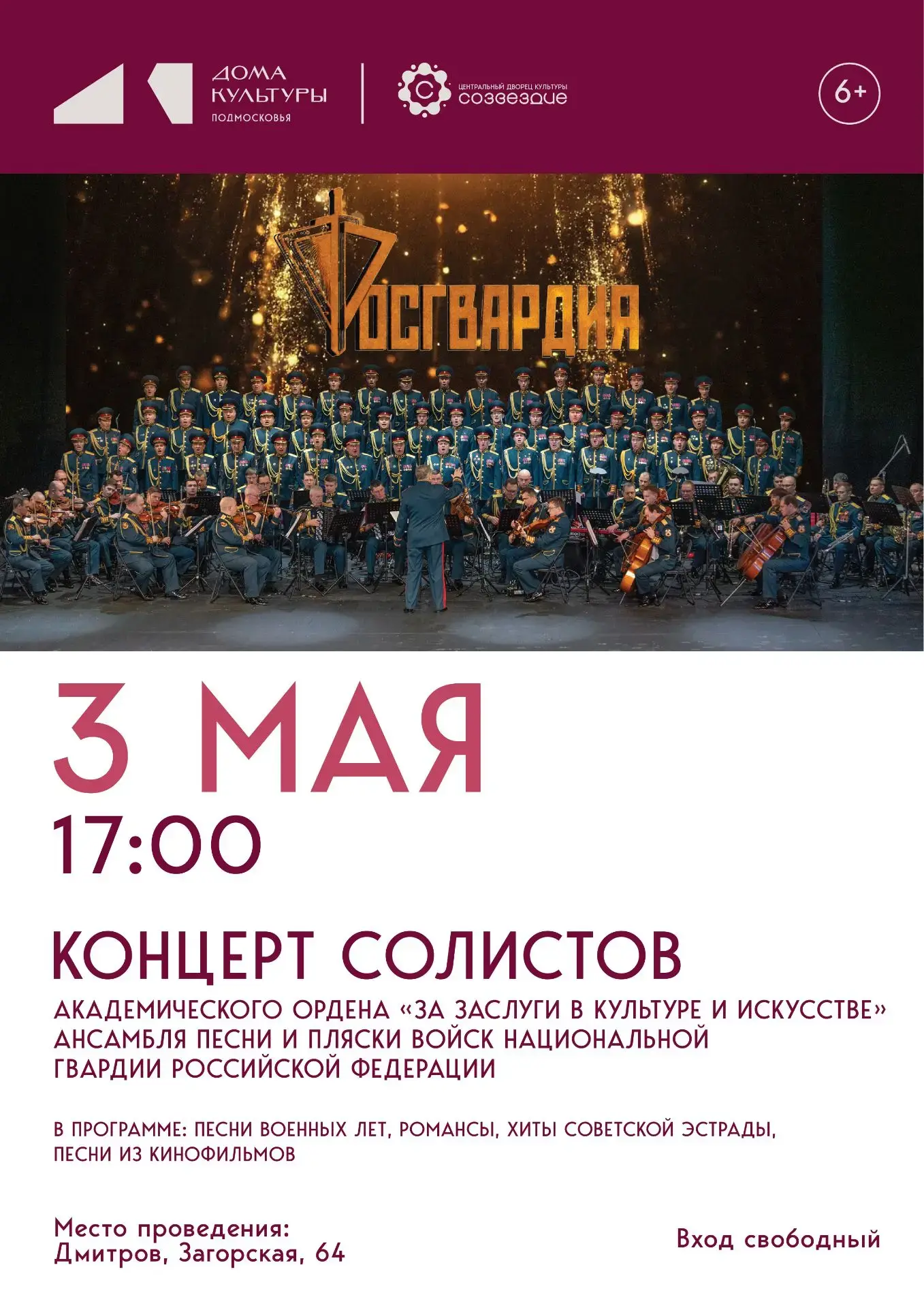 На сцене ЦДК «Созвездие» с благотворительной программой выступят солисты Академического ордена «За заслуги в области культуры и искусства» — ансамбля песни и пляски Войск Национальной гвардии Российской Федерации.